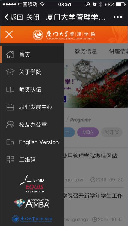 管理学院在中英文版网站建设的基础上,推出移动端中英文双语微信版网站。