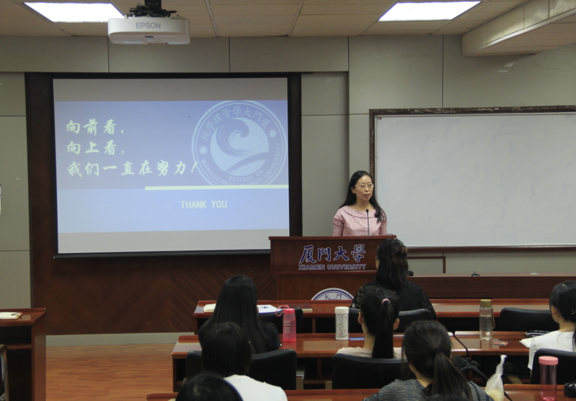 会议开始,党委副书记洪秋霞首先发表讲话。她指出:“天下大事必作于细,天下难事必作于易”,重点强调了细节的重要性,并提到,在开学的半个月里,学生干部们的工作质量仍有一定提升空间,告诫大家一定要用更高的标准要求自己,不断提升自我,为学院做出更大的贡献。随后,她从“党建工作、宣传工作、学术氛围、素质教育、实践育人、修身立德”六个方面为大家详细介绍了过去一年管院学生工作的开展情况,并从“加强学生骨干群体建设”、“推进校园文化建设”、“提升创新实践能力”、“提升学生工作管理服务质量”几个方面对下半学期的工作提出了展望。最后,洪老师以一句“向前看,向上看,我们一直在努力”为讲话画上了圆满的句号,并收获了热烈的掌声。
