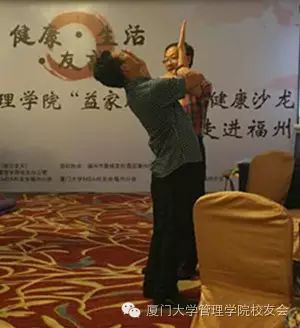 张老师邀请全体校友站起来,两脚分开与肩同宽站稳,双手交叉置于胸前,用自己的习惯往后伸展脊柱,做类似伸懒腰的动作,用心感觉伸展的角度和腰的压力。呵呵!现场传来了"腰酸、腰痛、有点吃力"等好几位校友的声音,张老师笑笑地点点头,他邀请大家继续体验第二种模式 :收缩臀肌,紧绷臀部,然后脊柱再次向后伸展。
