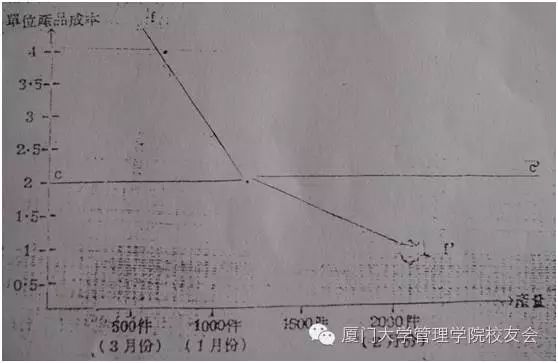 当产量小时,单位产品上承担的固定开支很大,所以成本处于高位;产量加大后,单位产品成本中的固定开支部分下降很快;而当产量再进一步增大时,单位产品成本线的下降就趋于缓和了,最终趋近于单位变动成本。论文是用下图表达每单位产品成本线的,由于只列了三个数据,只表现为一条折线,所以不易理解。60多年前数学方法用于会计或许还不完善,我们现在当然可以用平滑曲线来精致地表达这个想法,设产量为n,那么就有“单位产品成本=单位变动成本+总固定成本/n”。不过,有时候粗砺的、“土得掉渣”的表述,倒可能意味着其思想的原创性。
