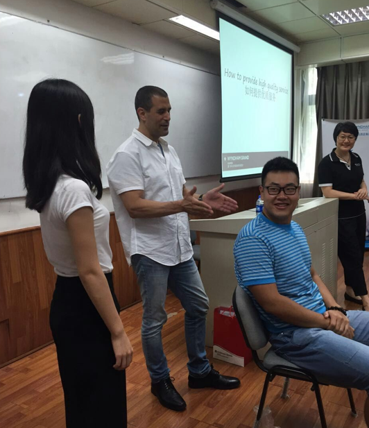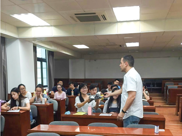 第一次讲座请到的是厦门润丰吉祥温德姆至尊酒店的总经理苏杰夫先生(Jeffrey Sussman)。他在简要介绍温德姆酒店之后便开始向同学们讲述优秀服务人员应该具有的七大信念,即广开言路(open communication),责任感(Accountability),服务(Service),诚信(Integrity),创新(Innovation),尊敬(Respect),授权(Empowerment)。为了让同学们更好的了解团队合作在酒店工作的重要性,他在讲述期间特意增加了互动环节,通过一个简单的小实验轻松让同学们对团队合作有了更深的认识。