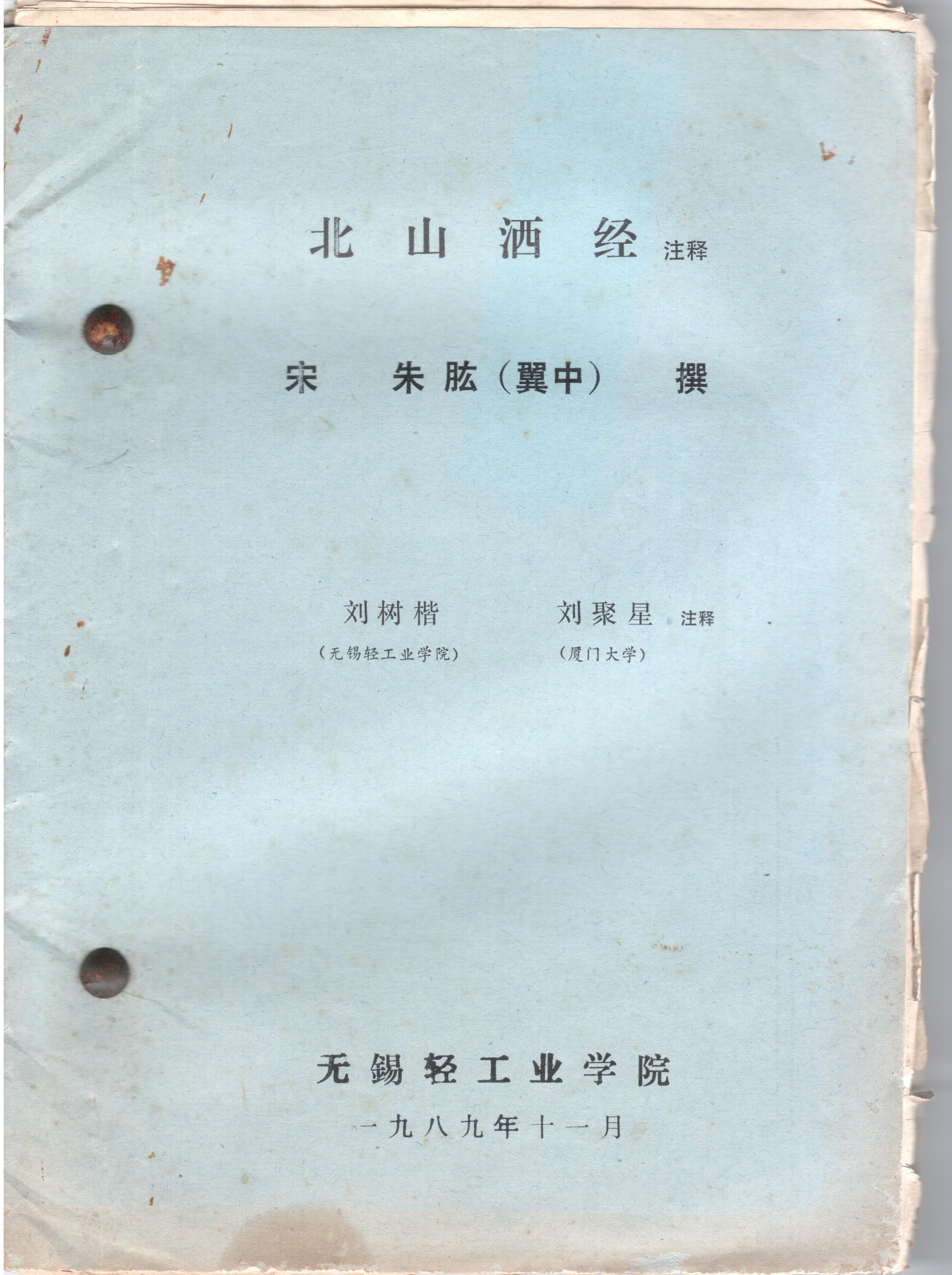 更奇的是,他参与注释宋代人所著的《北山洒经》(“洒”通“酒”),注释本还被无锡轻工业学院(食品工业重镇,今并入江南大学)作为教学用书。《北山洒经》是我国古代唯一的酿酒经典著作,全书分上﹑中﹑下三卷,上卷是总论,中卷讲作曲,下卷讲酿酒。他的合作者刘树楷教授在化学工业和制糖工程方面造诣颇深,早在五十年代就在国内享有很高声誉,曾发表《美国四所大学见闻》曰:“一九八五年五、六月问,我应邀赴加拿大参加围际制糖学术会议,会后被邀请去参观加拿大和美国的几座糖厂…”,可见在国际制糖业也是有影响的。如此专业的人士还需要有合作者,很可能他需要倚重的,是刘聚星在注释方面的古文功底,不禁对我们老学长的学识之渊博五体投地!