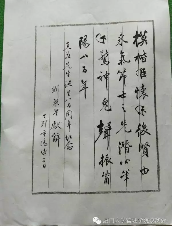 本系年轻的学子们素质极高,近年来涌现不少“跨界”奇才,或主营业务与会计全然无关的,如当主持人、当导演、搞艺术品拍卖等;或主营会计之外另有其他跨界玩法的,如造“单单娃”的“单单猪”,等等,不一而足。刘聚星学长的故事告诉我们,厦大会计人的“跨界风”不自今日始,而是由来已久的。