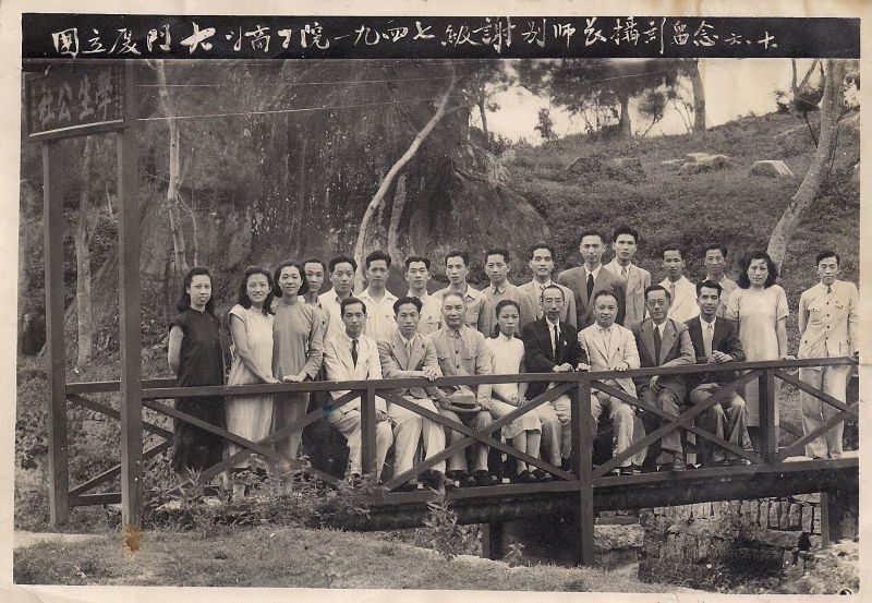 我顺便对照片也作了些考证。与我们现在入学年份称为“级”,毕业年份称为“届”不同,当时是以毕业年份为“级”的。所以按现在的说法,这其实是1947届的厦门大学商学院学生毕业照。现在的厦门大学人类博物馆(当年叫“博学楼”)正前方二十余米的左边.就是照片中小木桥的位置。桥头上可见"学生公社"字样, 因过该小桥可通往一栋二层小楼即“学生公社”所在地,是当时为学生介绍家教、讲课、代刻蜡纸等勤工俭学机会的公益机构,由一基督徒陈德辉当干事,本系师长黄国雄当年读书时,就常在此刻蜡纸挣生活费。
