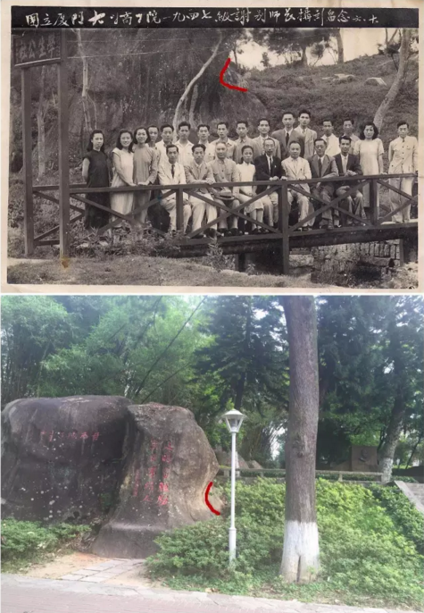 沧海桑田,当年的大水沟今已不存,但小桥对岸影中人背后的那石壁至今还在(在新老两张照片中,从其右侧划了红线的圆弧状缩进处对比,即可辨认),石壁上现有方毅于1981年的题词“及时当勉励,岁月不待人”,其后就是今建南大会堂所在地。