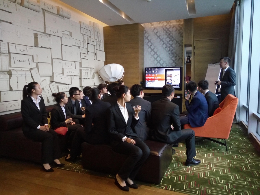 在磐基皇冠假日酒店, 两组同学在礼宾部经理和前厅大使的带领下走进了16层的行政层,行政层的负责人详细地介绍了行政层的组成部分、用途和包括VIP服务的酒店环境。随后在小型的会议厅里面,同学们跟酒店管理层进行了互动交流,问题开始于林建衡同学提出的“在公款消费受到很大打击的现在,酒店会不会受到影响,磐基是如何解决的呢?”,紧接着“酒店房间在网络上需要提前七天甚至更久预定会不会影响酒店的入住率?”“、“酒店成立至今最大的问题是什么?”、“房间宽带需要收费会不会影响客源入住?”小小的会议室里面气氛分外热烈,前厅部经理耐心的解答了各种问题。