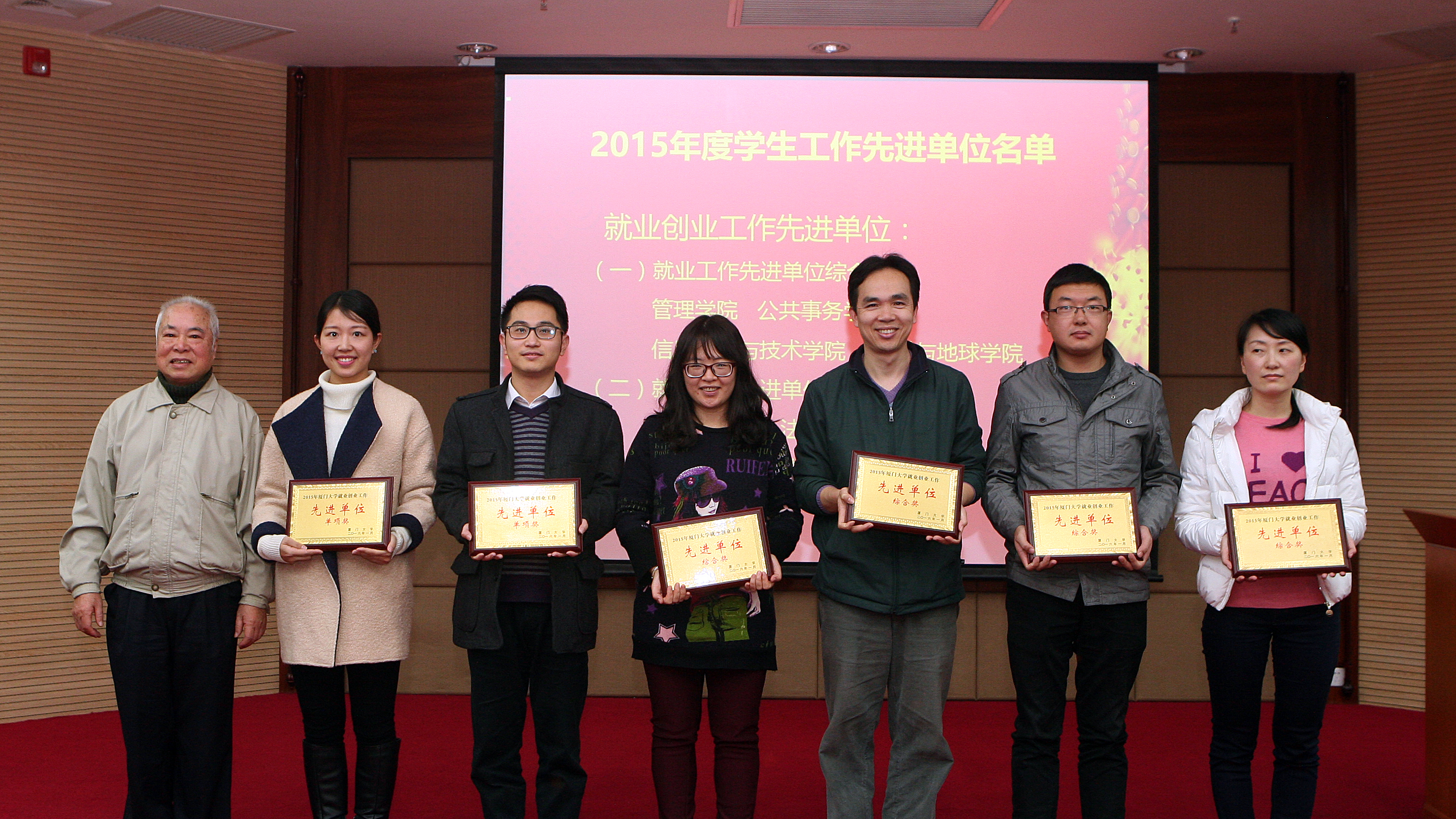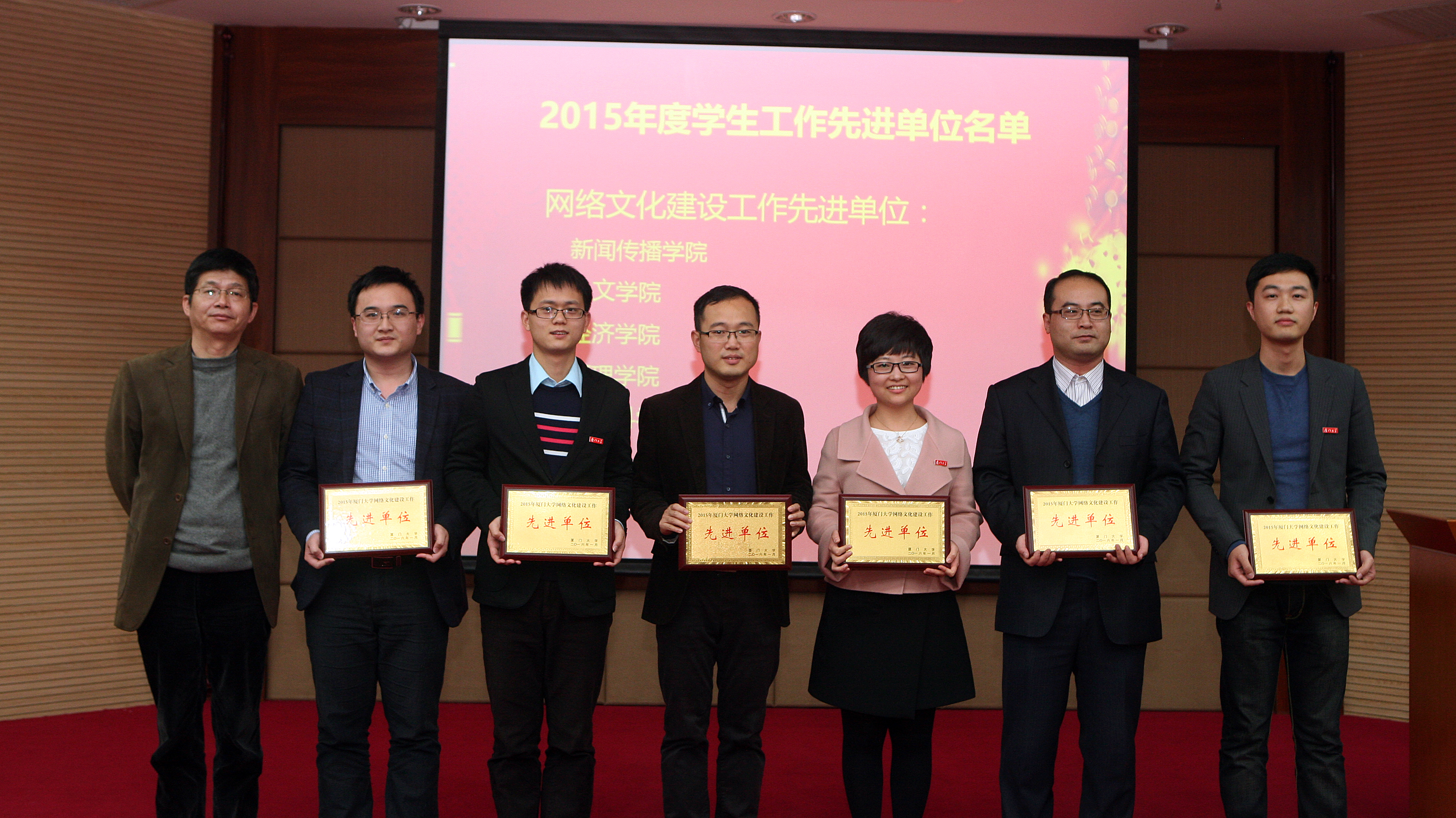 大会对2015年度学生工作先进单位和2015年考核优秀的辅导员进行了表彰。此次表彰共评选六类奖项:就业工作先进单位6个、心理健康教育工作先进单位6个、网络文化建设工作先进单位6个、学生学业学术科技创新创业工作先进单位6个、志愿服务工作先进单位6个、暑期社会实践工作先进单位6个。我院获评“就业工作先进单位”、“心理健康教育工作先进单位”、“网络文化建设工作先进单位”、“学生学业学术科技创新创业工作先进单位”和 “暑期社会实践工作先进单位”等五项表彰。学院辅导员吴光锡作为2015年考核优秀的辅导员受到表彰。我院是本年度获得表彰奖项最多的两个单位之一,彰显了我院学生工作的科学化水平以及在全校的引领示范作用。