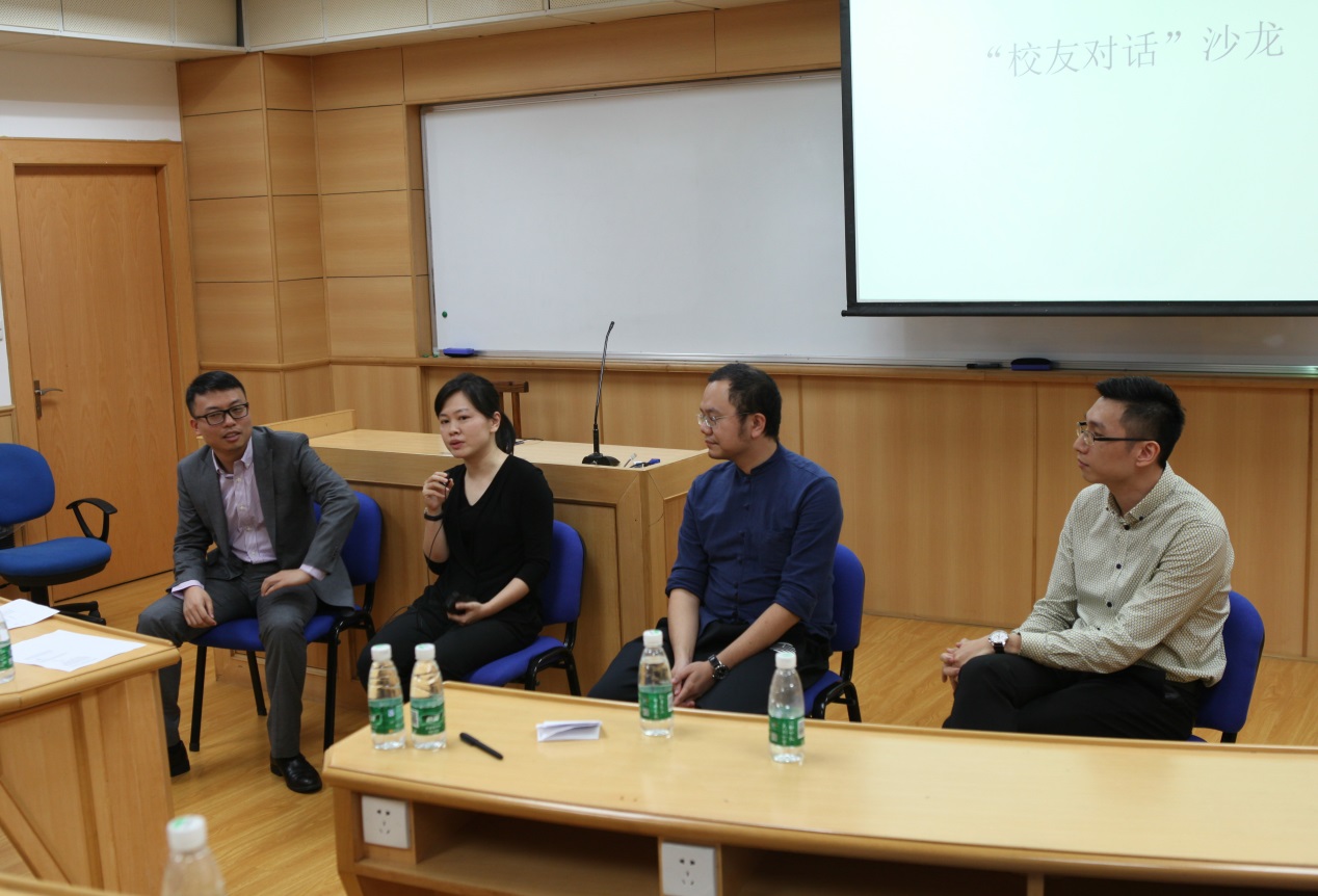 最后,由2000级校友康毅、郑虹、黄嵩以及2004级校友王庭磊作为主持嘉宾,与所有到场的校友代表和在学同学,展开“校友对话”沙龙。沙龙讨论了工作、生活、创业等话题,气氛热烈愉快。