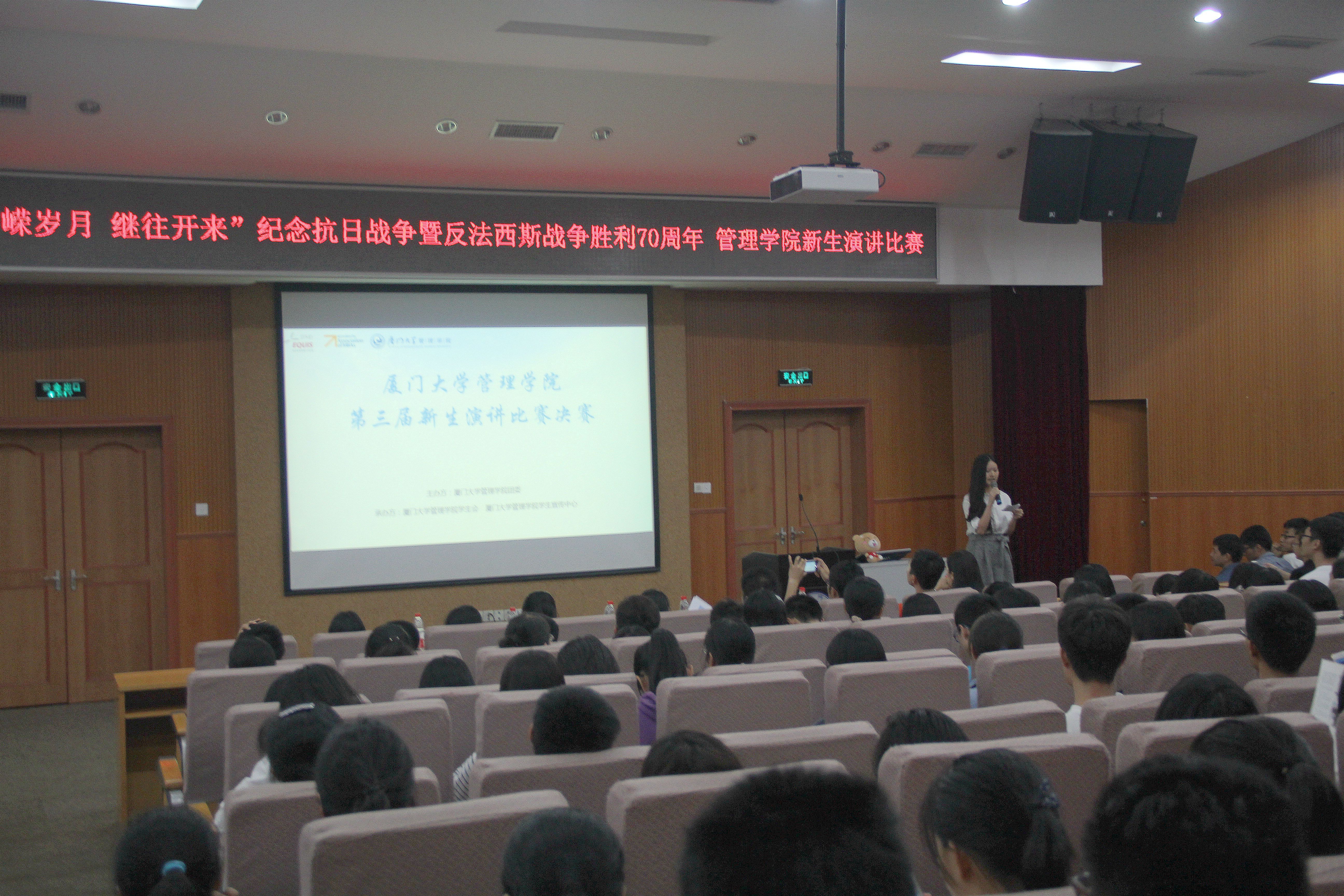 2015年10月17日晚,“峥嵘岁月,继往开来”管理学院第三届新生演讲比赛决赛在化学报告厅举行。校团委艺术文化部部长周林琪,校学生处教育科副科长刘群鑫,管理学院团委书记、学生工作办主任江娇,团委副书记吴荣梅、周颖,辅导员邵亢邑、吴光锡出席活动并担任比赛评委。比赛由2014级本科生杜京琪主持。据悉,本次比赛以“大学之道”与“当代年轻人的家国情怀”为主题,旨在纪念中国人民抗日战争暨世界反法西斯战争胜利70周年,引导大学生论大学之道,囊家国情怀,昂扬斗志,显尽风华。