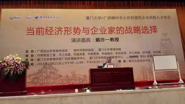 10月21日,广西壮族自治区党委统战部、柳州市委统战部联合厦门大学管理学院在柳州举行“广西柳州非公有制强优企业高级人才培训”,邀请戴亦一教授做主题演讲。柳州市委常委、统战部部长向军出席并发表讲话。来自柳州两新党工委、工信委、国资委、商务委、金融办、工商联等单位的800多名听众聆听了戴老师《当前经济形势与企业家战略选择》的演讲。