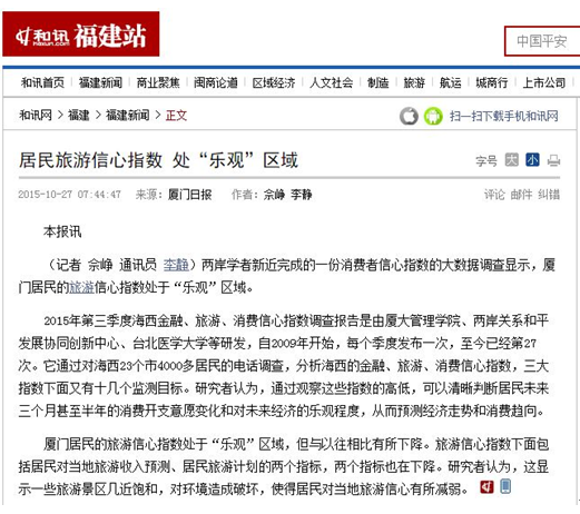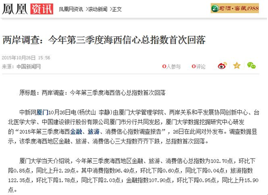 2015年10月26日上午,由厦门大学管理学院、两岸关系和平发展协同创新中心、台北医学大学、中国建设银行股份有限公司厦门市分行共同发起,厦门大学数据挖掘研究中心研发的“2015年第三季度海西金融、旅游、消费信心指数调查报告”正式发布。