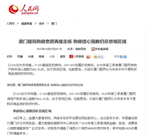 人民网:厦门居民购房意愿再度走低 购房信心指数扔在悲观区域