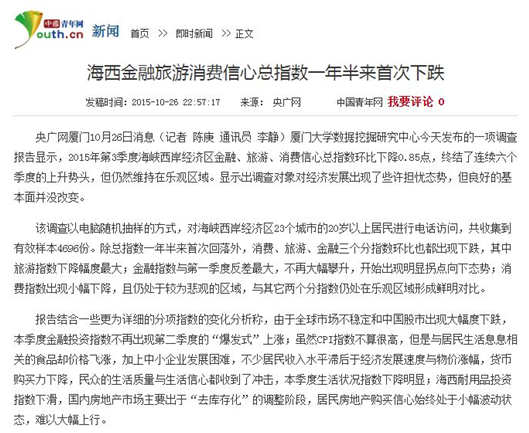 2015年第三季度海西金融、旅游、消费信心指数调查报告是由厦大管理学院、两岸关系和平发展协同创新中心、台北医学大学等研发,自2009年开始,每个季度发布一次,至今已经第27次。它通过对海西23个市4000多居民的电话调查,分析海西的金融、旅游、消费信心指数,三大指数下面又有十几个监测目标。研究者认为,通过观察这些指数的高低,可以清晰判断居民未来三个月甚至半年的消费开支意愿变化和对未来经济的乐观程度,从而预测经济走势和消费趋向。