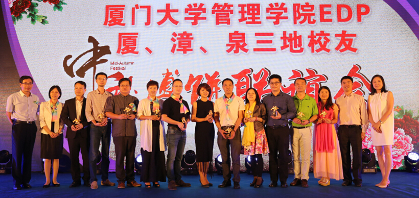 中秋佳夜,E路有你!10月11日,厦门大学管理学院EDP一年一度的校友中秋联谊晚会盛大举行,福建省工商联主席王光远教授、厦门大学校友总会秘书长曾国斌先生、厦门大学管理学院党委书记沈维涛教授、厦门大学管理学院党委副书记李峰老师、管理学院EDP中心朱平辉主任、何燕珍副主任、章永奎副主任、吴育辉副主任、陈萍副主任、银鹭集团董事长、第五届理事会新任会长陈清渊先生、惠龙集团董事长、第五届理事会执行会长林文龙先生、厦门海西明珠创新园区董事长许翰龙先生等出席本次联谊晚会,并与来自厦、漳、泉三地的新老校友同欢,共享“E路有你,创新未来”的中秋联欢之夜。管院EDP中心第十七期资本运营总裁班学员丁江,第十九期企业总裁班、第二期工信部领军人才班学员魏慧华主持本场晚会。
