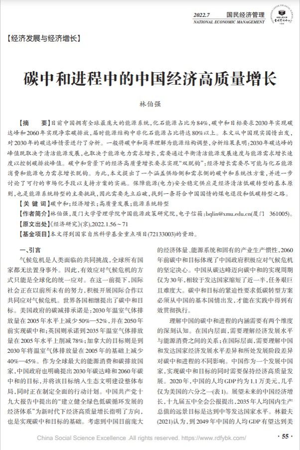 近日,《中国社会科学文摘》2022年第8期转载了我校管理学院林伯强教授的文章《碳中和进程中的中国经济高质量增长》,此前《新华文摘》2022年第12期、《人大复印报刊资料》的《国民经济管理》2022年第7期全文转载了该文章。该文原发表于2022年第1期《经济研究》,为国家自然科学基金重点项目的阶段性研究成果。