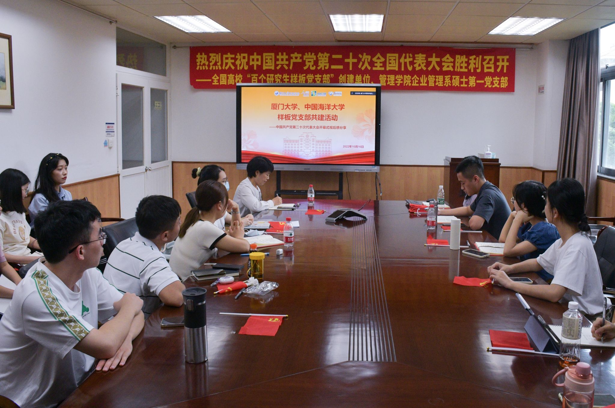 开幕会后,厦门大学管理学院企业管理系硕士第一党支部与中国海洋大学管理学院红旗智援博士团党支部成员相聚线上会议室,围绕二十大报告内容,畅谈学习感想,分享心得体会,展望未来支部建设工作。