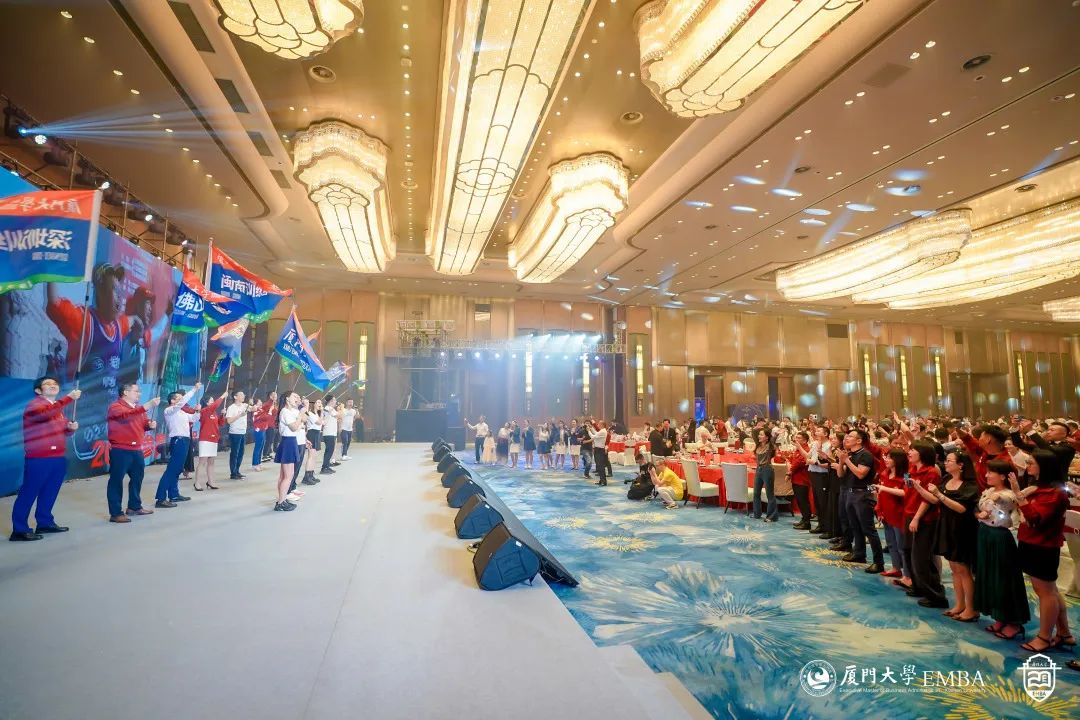 在E家人温馨的歌声中,邱七星书记和李常青主任从舞台中间,带领2002级-2022级的21位校友代表走向台前,每一个人都代表了厦大EMBA的一载春秋。领导们将厦门大学EMBA旗帜传递给校友,旗帜的传递寓意着传承与希望,厦门大学EMBA二十载弦歌不辍,二十载薪火相传。全体主持人、讲述人、演职人员们都到台前谢幕,现场变成一片欢乐的海洋。