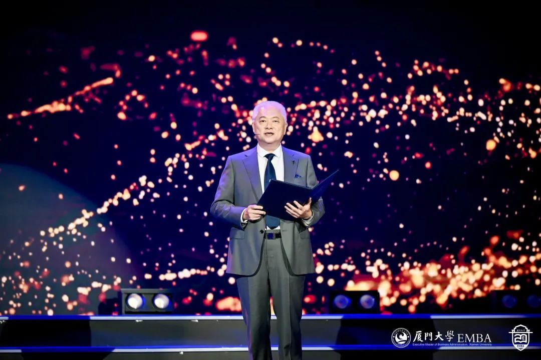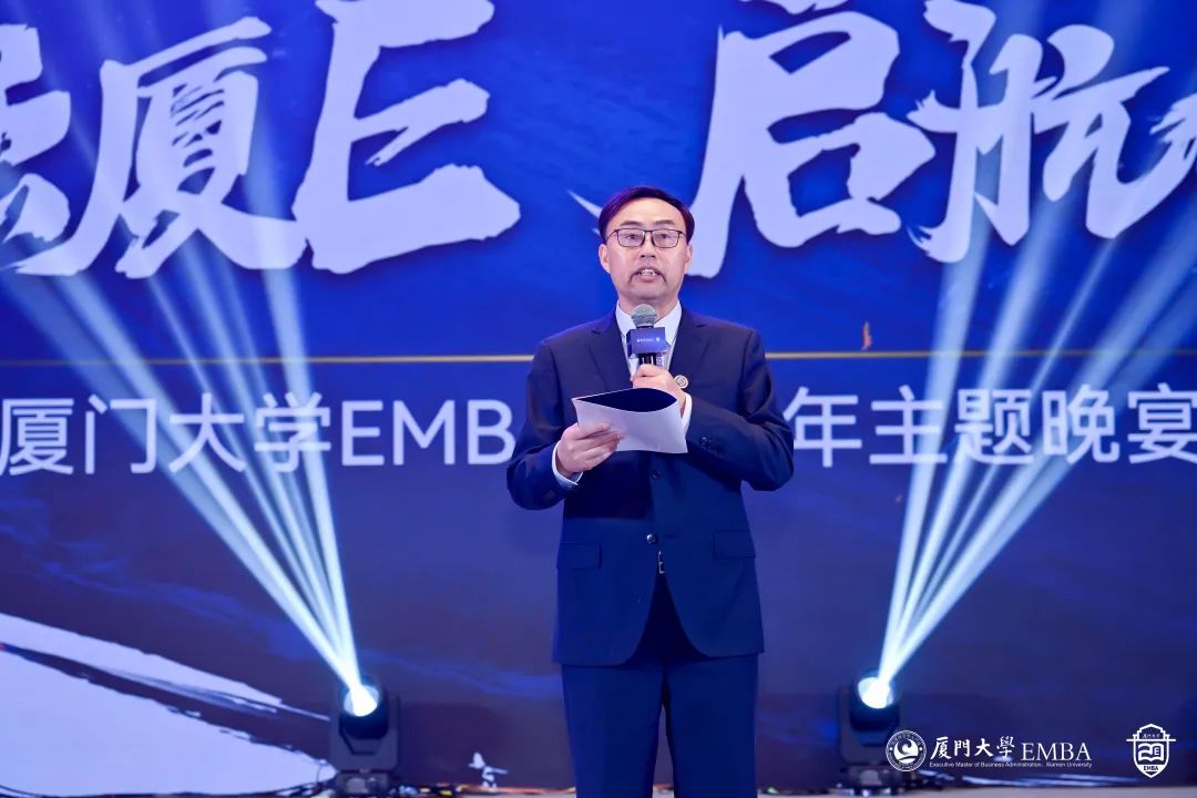 厦门大学管理学院党委书记邱七星代表学院致辞。邱七星向过去20年以来关心和支持厦门大学EMBA办学事业发展的学校领导、校友们和社会各界朋友致以最诚挚的感谢和最崇高的敬意。二十年前,厦大EMBA教育项目创办最重要的一个初衷就是:秉承嘉庚精神,创办一流商学院。我们围绕领导力(Leadership)、战略性眼光(StrategicalView)、国际化视野(GlobalProspective)和富有社会责任感(SocialResponsibility)的教育理念来设计培养课程和教学模块,坚持“学以致用、学以致道、道用结合、以道为主”的四个重要方针,可以用“一个初心、两个坚持、三个阶段、四种文化、五个一流”来总结厦门大学EMBA的20年,即立德树人、培养高层管理者的初心,坚持全国布局、坚持市场化原则,从单证、双证到多钟办学方式并存三个阶段,独特的嘉庚文化、学习文化、金融文化、运动文化,以及一流的学生、一流的师资、一流的课程、一流的管理和服务、一流的教学环境和设施。
