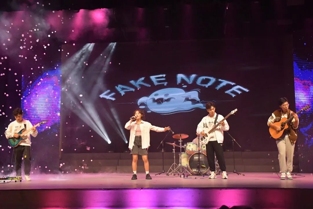 舞台灯光由明转暗,Fakenote乐队成员徐徐登场——晚会也正式进入到第二章“逐·浪奋楫闯天涯”。Fakenote乐队为大家带来歌曲串烧《海芋恋、海浪》,乐队成员娴熟的演奏技巧以及主唱扎实的唱功博得观众的阵阵欢呼与掌声,将晚会推上了一个高潮。