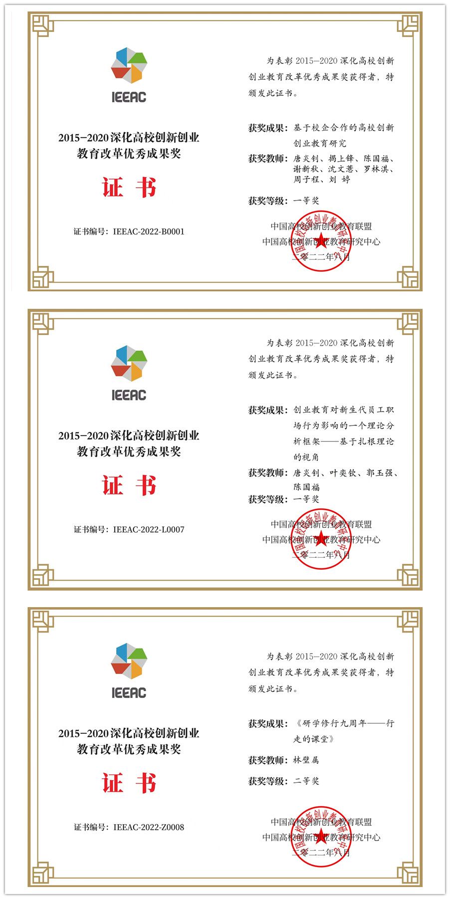 近年来,扎根中国大地,研究中国问题,提出解决方案,取得较好成绩:近5年来,学院创新创业团有30个项目获省级以上奖励,9个教改项目获得省级、国家级立项,7门课程获评省级、国家级“一流本科课程”,出版教材、专著13部,发表中外文学术论文达27篇。这次“2015-2020深化高校创新创业教育改革优秀成果”成绩的取得,有利于系统梳理和总结对中国高校创新创业教育深化改革有重大影响的标志性研究成果,促进国内外创新创业教育交流与合作,为中国高校创新创业教育高质量发展提供厦大智慧。