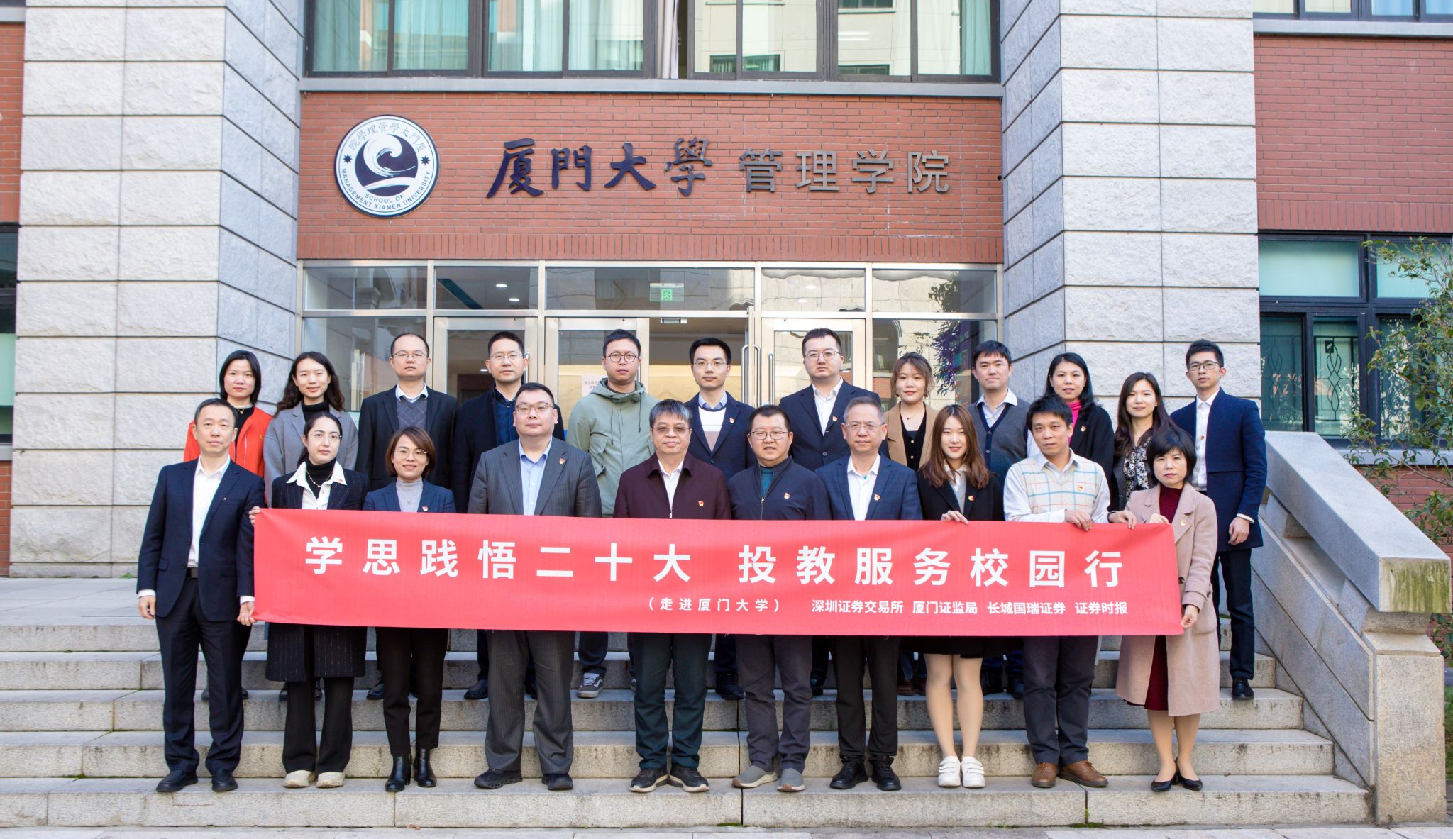 2023年2月16日,“学思践悟二十大”主题活动在厦门大学管理学院召开,活动围绕“科教兴国 人才强国”、“投资者教育走进校院 加大证券基础知识普及力度”等深化交流与合作。厦门证监局法律事务处处长朱玲、深圳证券交易所投资者服务部总监张雪峰、衍生品部总监陈炜、长城国瑞证券总裁李鹏、厦门大学管理学院党委书记邱七星、副书记郑碧娇、财务学系系主任吴育辉教授、副系主任沈哲教授等出席本次活动。