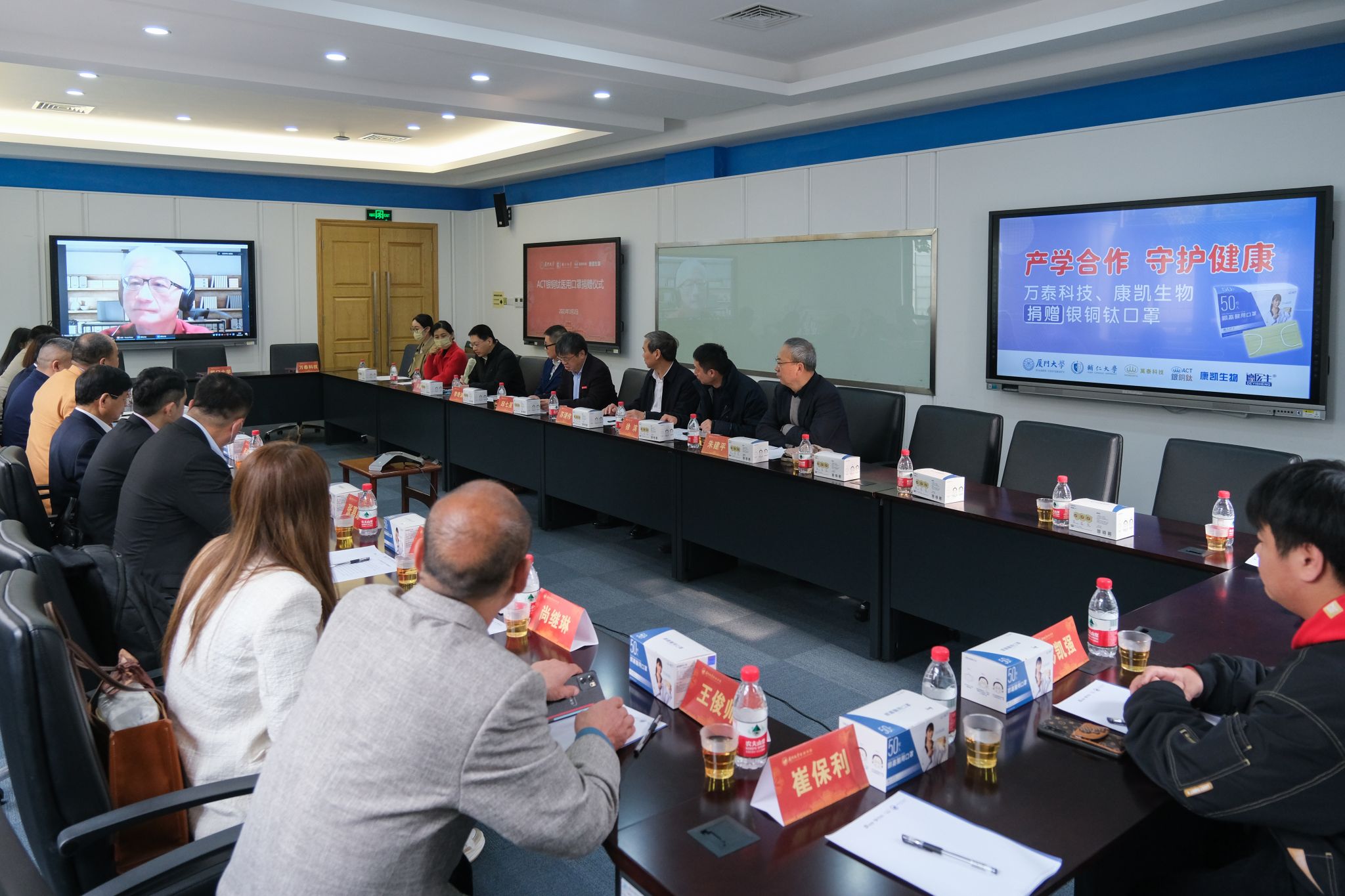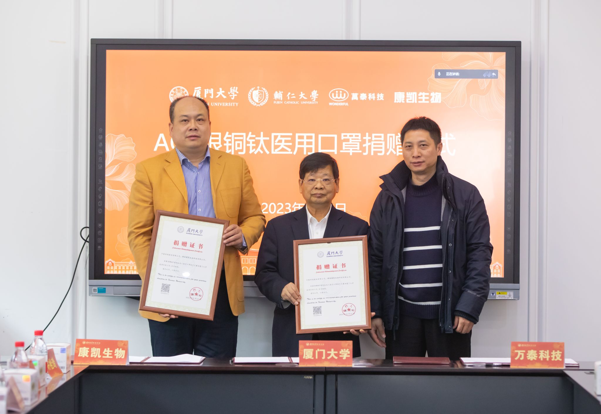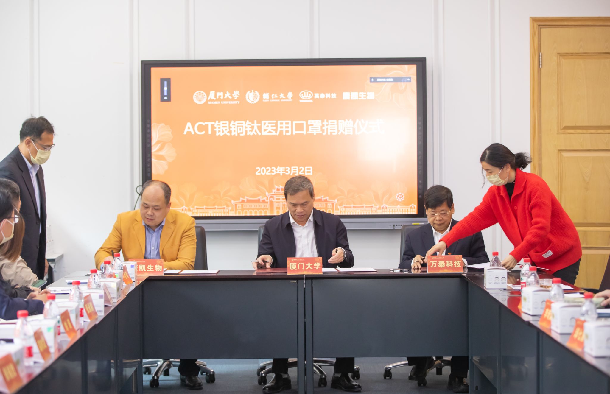 在辅仁大学谢邦昌副校长的联络和推动下,台湾万泰科技股份有限公司和湖南康凯生物科技有限公司联合向我校捐赠ACT银铜钛医用口罩50万片。3月2日上午,ACT银铜钛医用口罩捐赠仪式在保欣丽英楼100会议室举行,万泰科技股份有限公司董事长张铭烈一行,湖南康凯生物科技有限公司总经理高时发一行,厦门大学资产与后勤事务管理处处长苏清伟、管理学院党委书记邱七星、教育发展基金会秘书处副秘书长徐滨、健康医疗大数据国家研究院副院长李奇渊、管理学院数据挖掘中心主任朱建平以及师生代表参加仪式,辅仁大学资源与事业发展副校长谢邦昌在线上参加仪式。