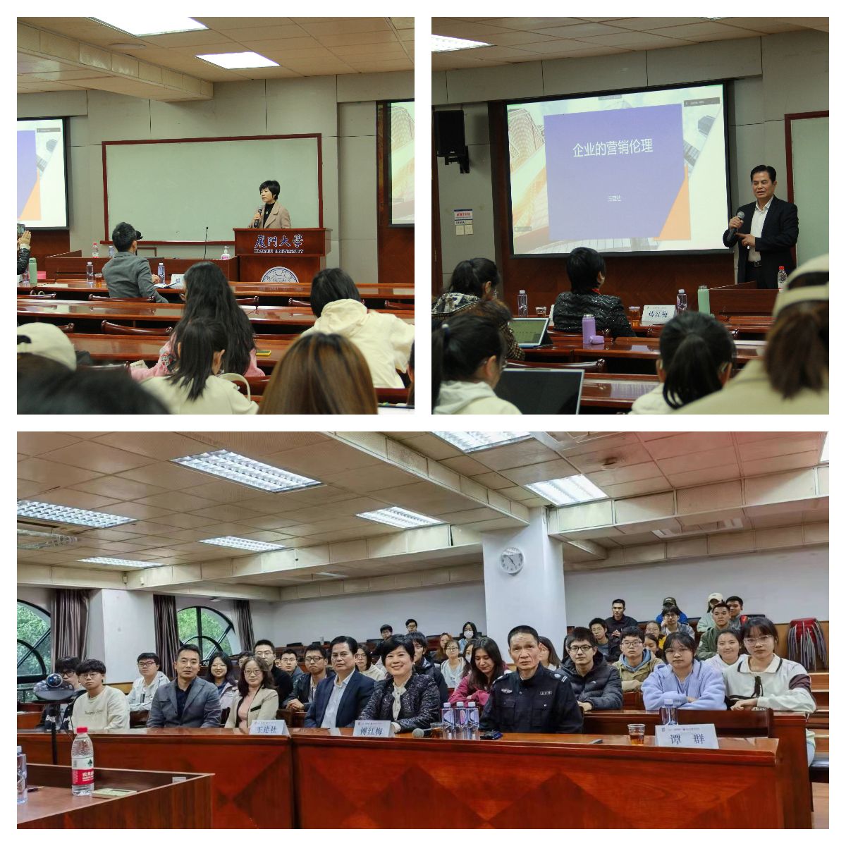 3月27日下午,管理学院《营销学原理》课程组和《营销伦理》课程结合授课内容,深入挖掘课程中蕴含的思想政治教育元素,邀请知名企业家王建社为同学们讲授了《关于企业的营销(商业)伦理及社会责任》专题讲座。此次讲座采取线上线下同步直播的方式进行,讲座由管理学院党委副书记郑碧娇主持,博弈企业管理顾问有限公司总经理傅红梅、市场学系副教授谭群、团委副书记揭上锋现场参加本次活动,营销学原理其他任课老师俞满娇、周晨希、高月涛、沈鹏、余天娇在各自班级教室组织线上同步学习。