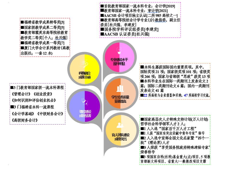 第一,专业建设水平提升明显。厦门大学会计学系现有会计学和审计学二个教育部国家一流专业建设点,通过 AACSB 会计项目独立认证,在教育部会计学教指委、国务院学科评议组、AACSB等组织中发挥着积极作用。
