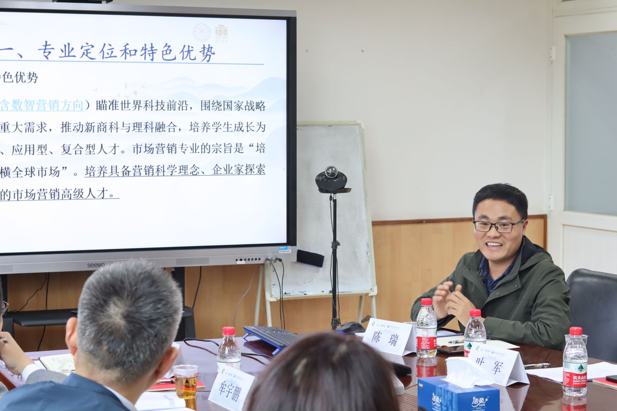 陈瑞副教授详细介绍了市场营销专业的历史沿革、专业定位和特色优势、课程体系设置和教学改革、师资队伍和基层教学组织建设、专业吸引力和学生培养去向。叶军教授就“数智营销”专业方向建设、教师人才队伍建设、科研反哺教学、校友资源维系分享了经验和思路。