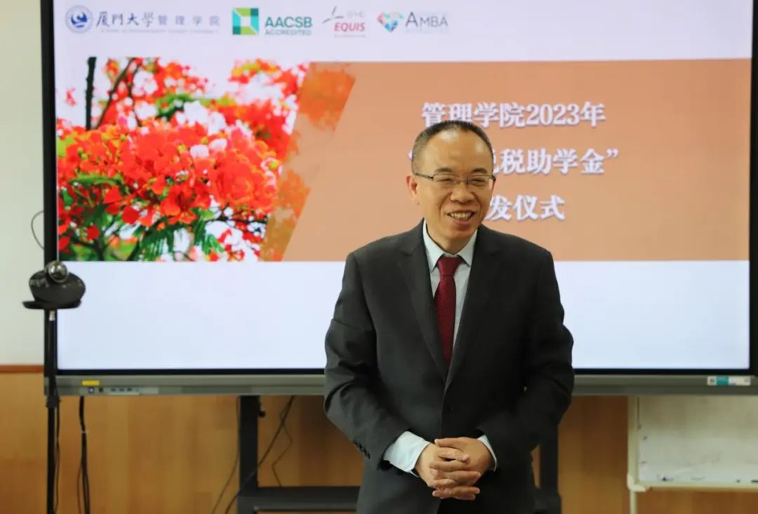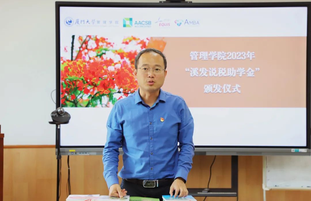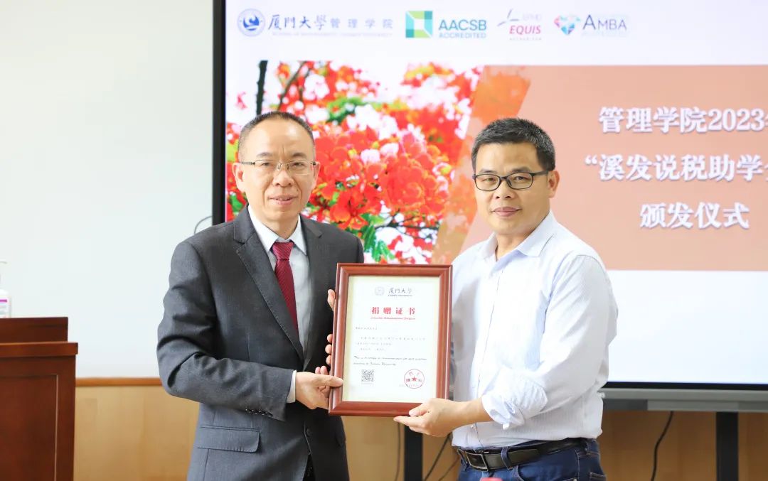 首先,在介绍完嘉宾和领导后,张国清为林溪发颁发了捐赠证书。紧接着,戴蓥宣读《管理学院2023年“溪发说税”助学金颁发决定》。