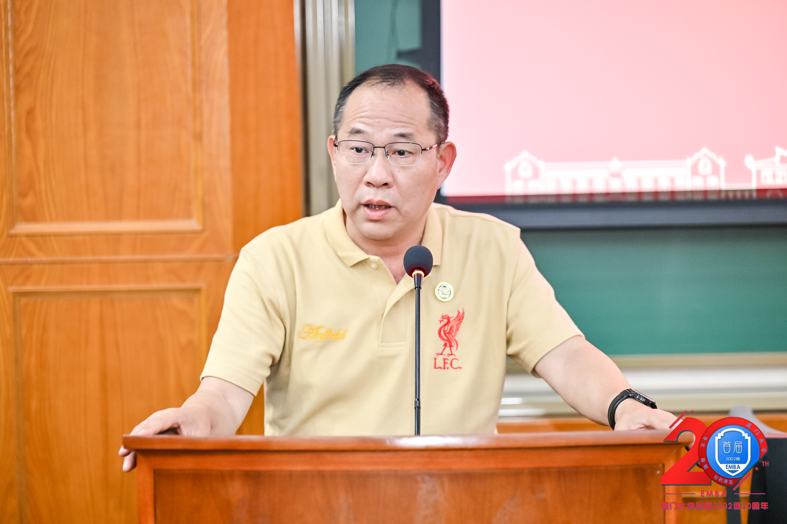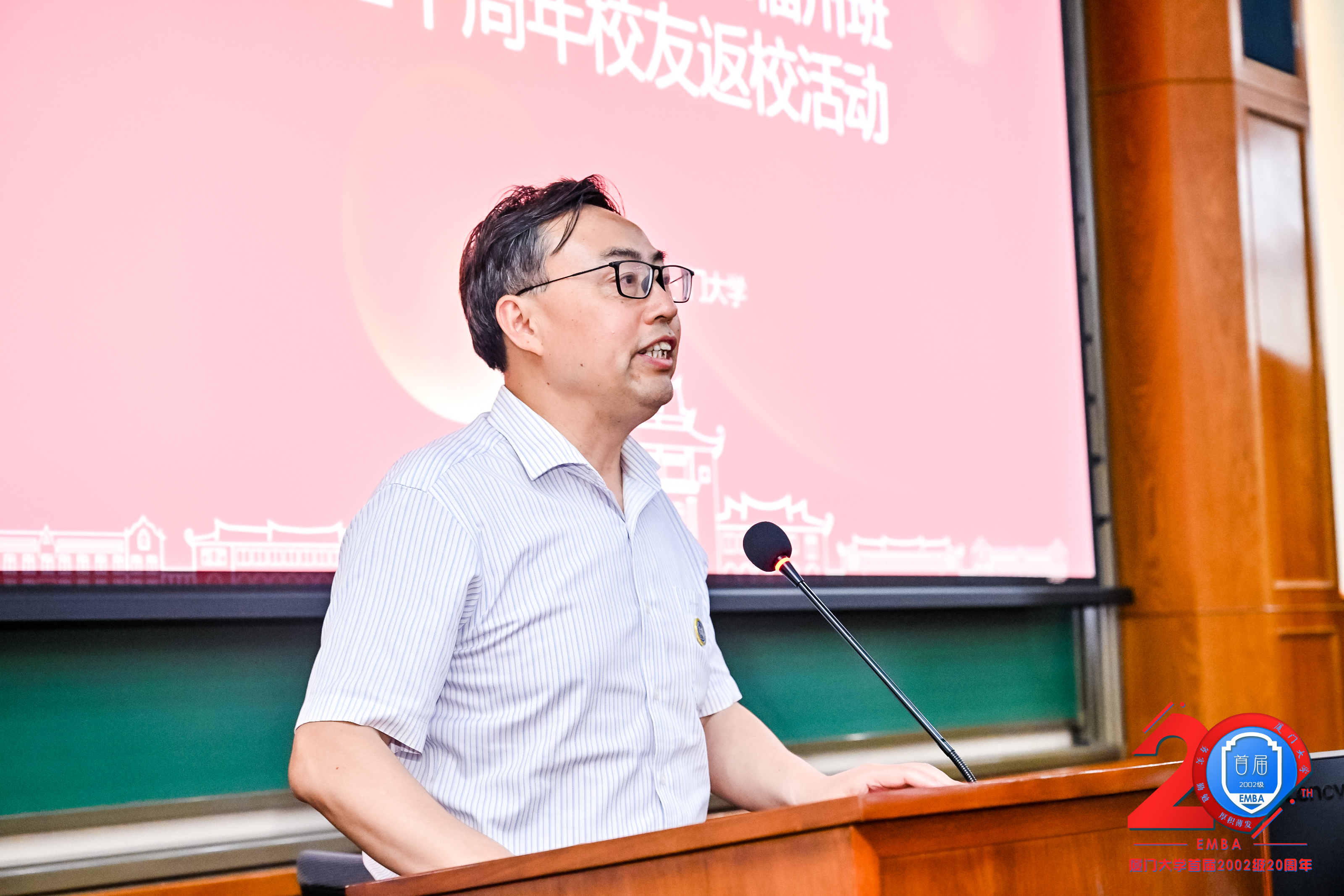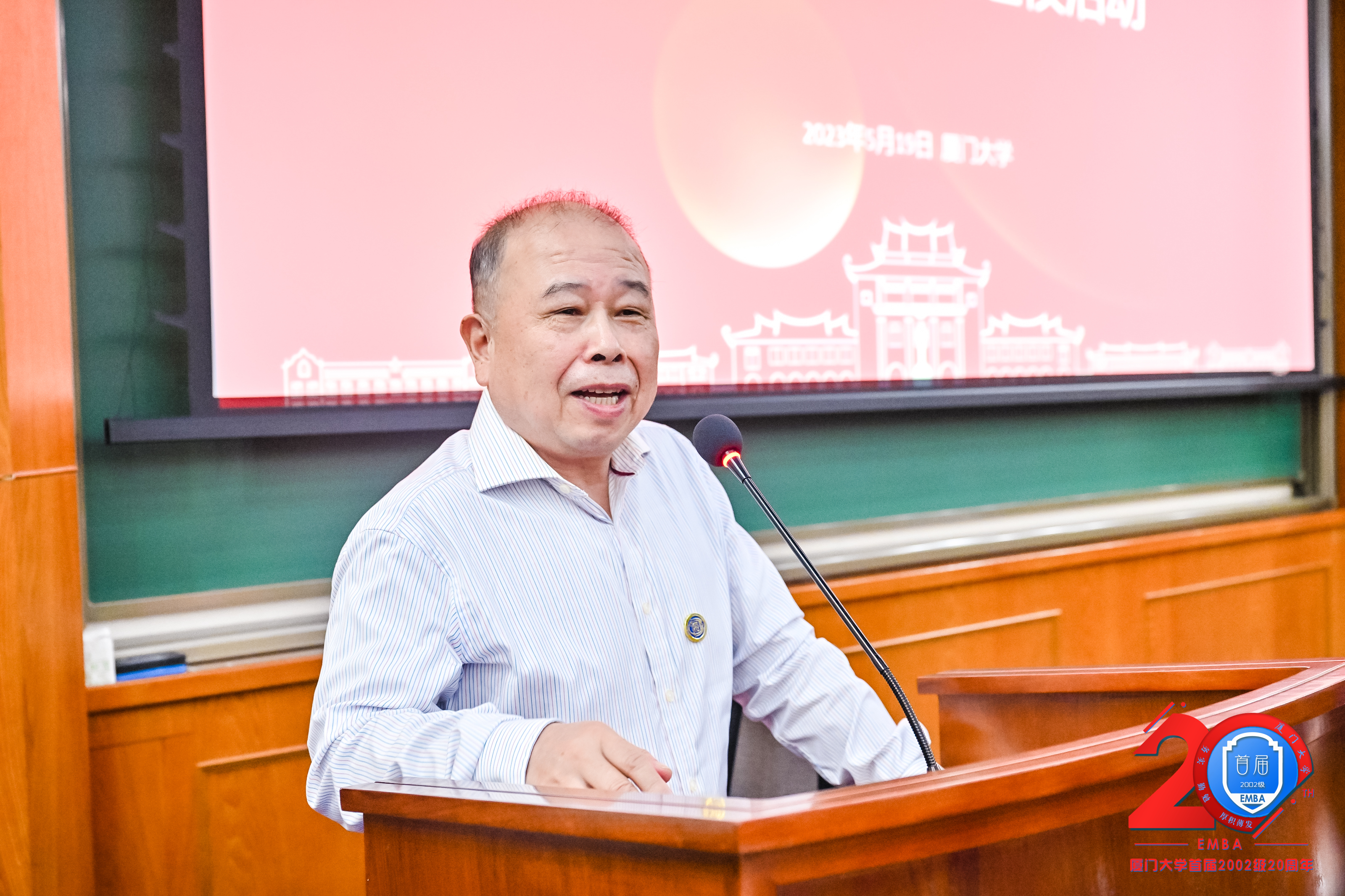 李常青教授感谢同学们21年前的选择,这让我们成为了E家人,也开启了厦大EMBA砥砺前行的序幕。李常青指出,21年来外部环境和学校内部都发生了很多变化,但是我们的教授队伍基本不变,学校发展EMBA教育的初心不变,EMBA服务于广大企业管理者同学校友的初衷不变。李常青向同学们简要报告了EMBA项目21年来的招生、教学、校友等发展情况,双证班、商领班以及国际化办学等方向。李常青说,厦门大学EMBA从2002级228位同学肇始,到现在培养了9000多位校友、开设190多个班级,正是自2002级打下的良好开局。李常青希望能多听到校友们的声音,希望校友们常回家、继续关心支持母校发展建设。