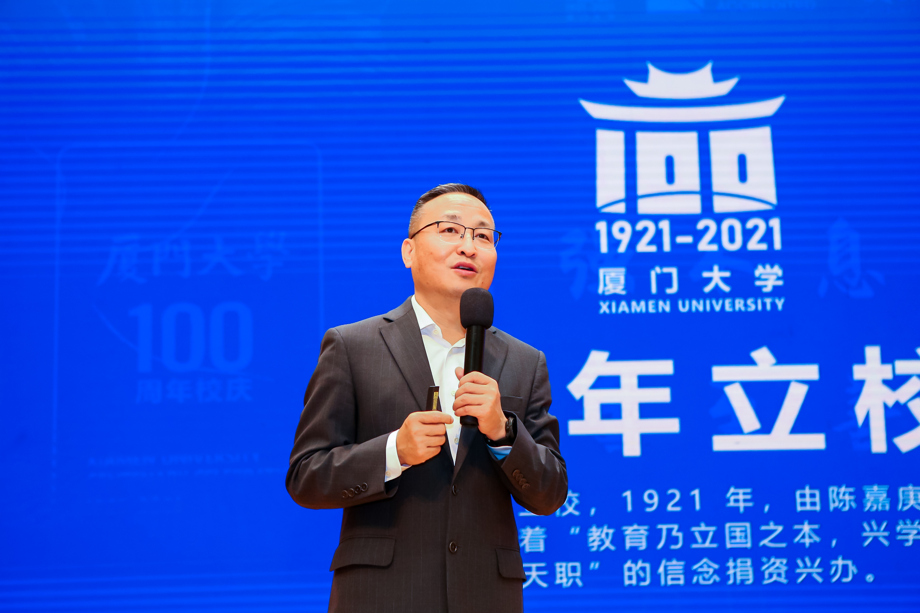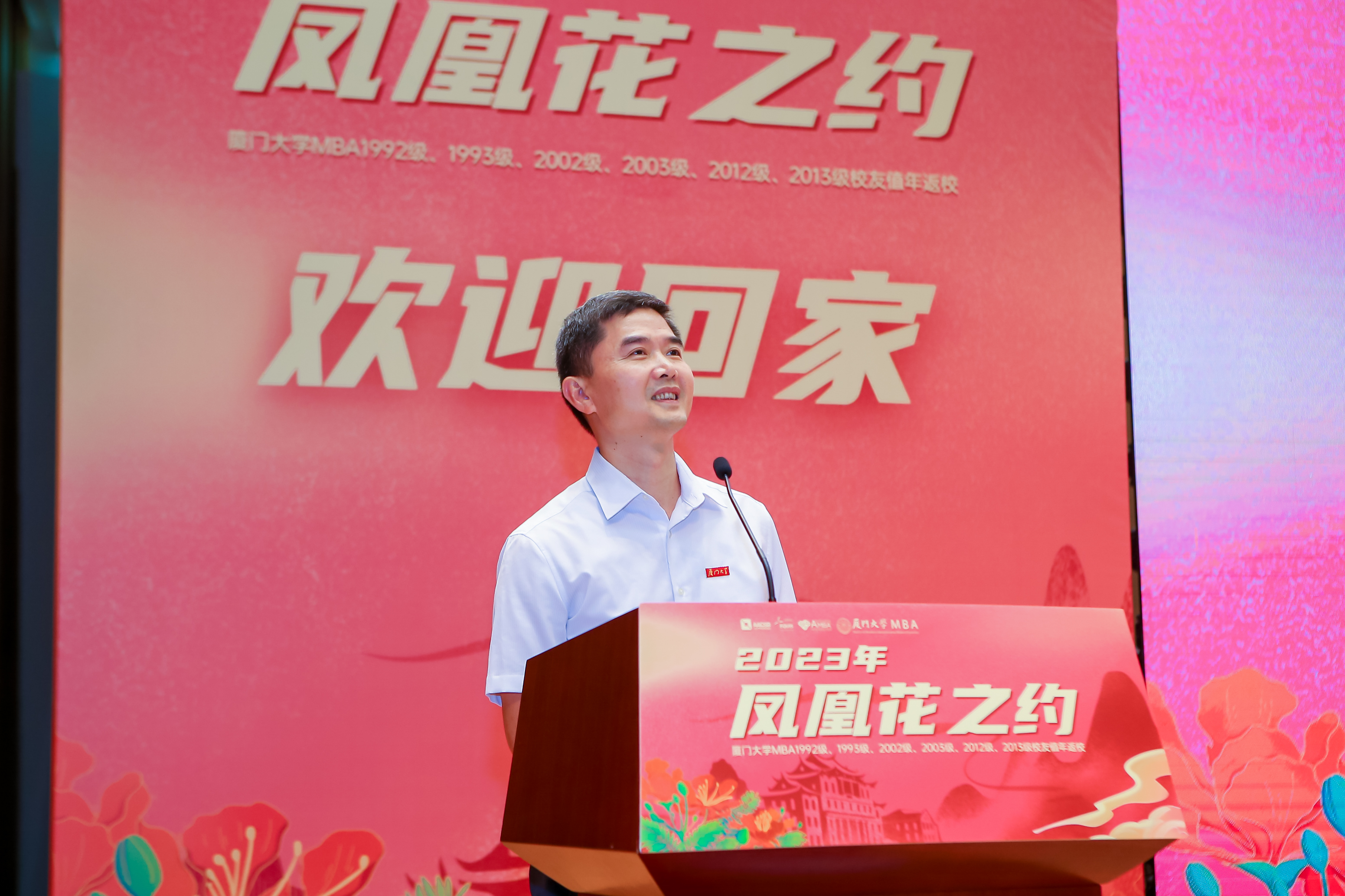 欢迎短片播放完毕,厦门大学管理学院党委书记张明智老师登台致辞。面对济济有众的MBA师生校友,他在讲话中首先表达了对校友返校的由衷欢迎,表示诸多校友为母校建设作出了卓越的贡献,母校以校友为荣,校友更为母校添彩。