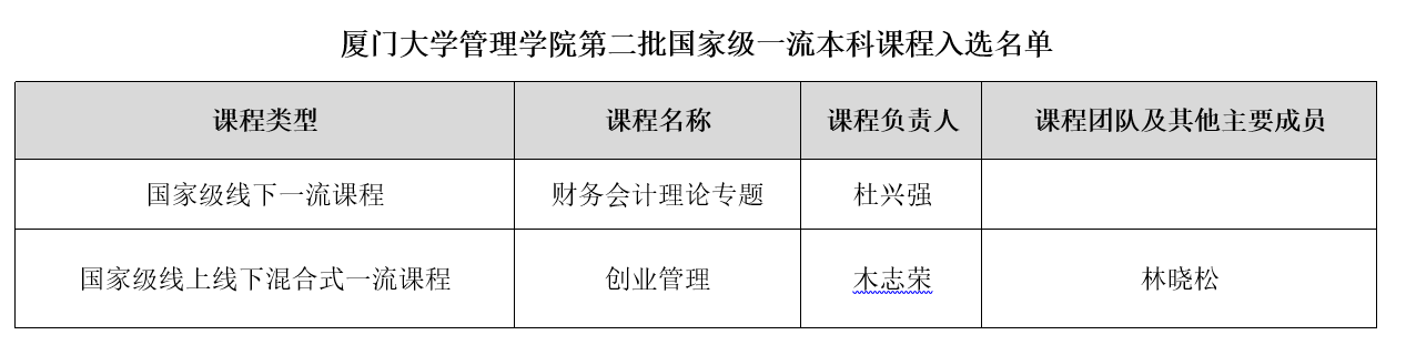 近日,教育部印发《教育部关于公布第二批国家级一流本科课程认定结果的通知》(教高函〔2023〕7号),正式公布第二批国家级一流本科课程认定结果。由各省级教育行政部门和高校申报推荐,经专家评议与公示,认定5750门课程为第二批国家级一流本科课程。其中,线上课程1095门,虚拟仿真实验教学课程472门,线上线下混合式课程1800门,线下课程2076门,社会实践课程307门。厦门大学共有28门课程入选,其中管理学院杜兴强教授负责的《财务会计理论专题》获得国家级线下一流课程、木志荣教授负责的《创业管理》获得国家级线上线下混合式一流课程。