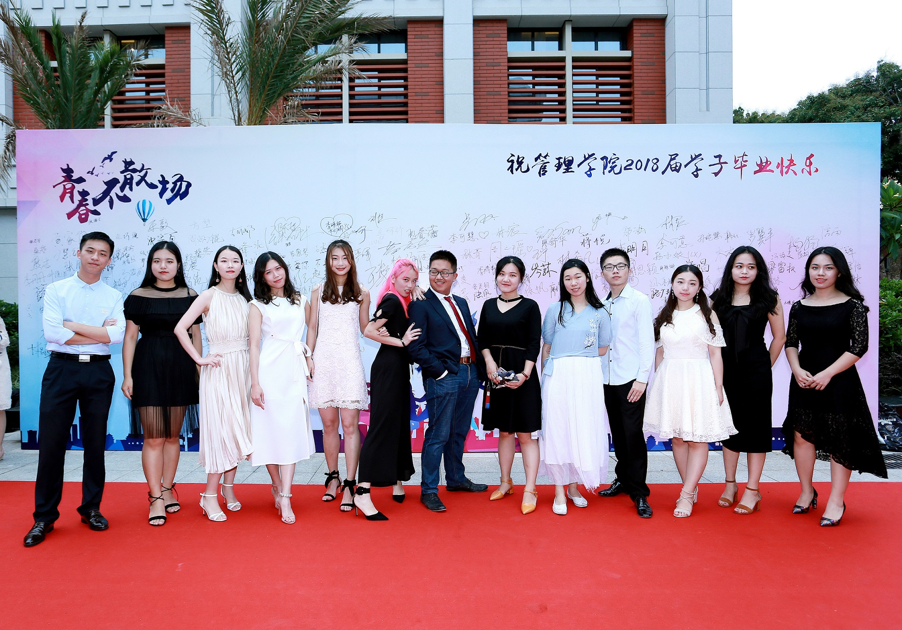 几日前的晚上,林梧桐楼酒店前,热闹非凡。这里是管理学院旅游与酒店管理系的教学科研基地,此时此刻,它与寻常大不相同。酒店门前,铺上了40米长的红毯,来自厦大管院的近千名本、硕、博毕业生,或宿舍舍友结伴,或情侣相依,或师生携手,在红毯上缓缓走过,在签名墙上郑重签下自己的名字。帅气的西装、优雅的礼服,炫彩的灯光,四处闪烁的闪光灯……此时此刻,他们每一个人,都是最耀眼的明星。