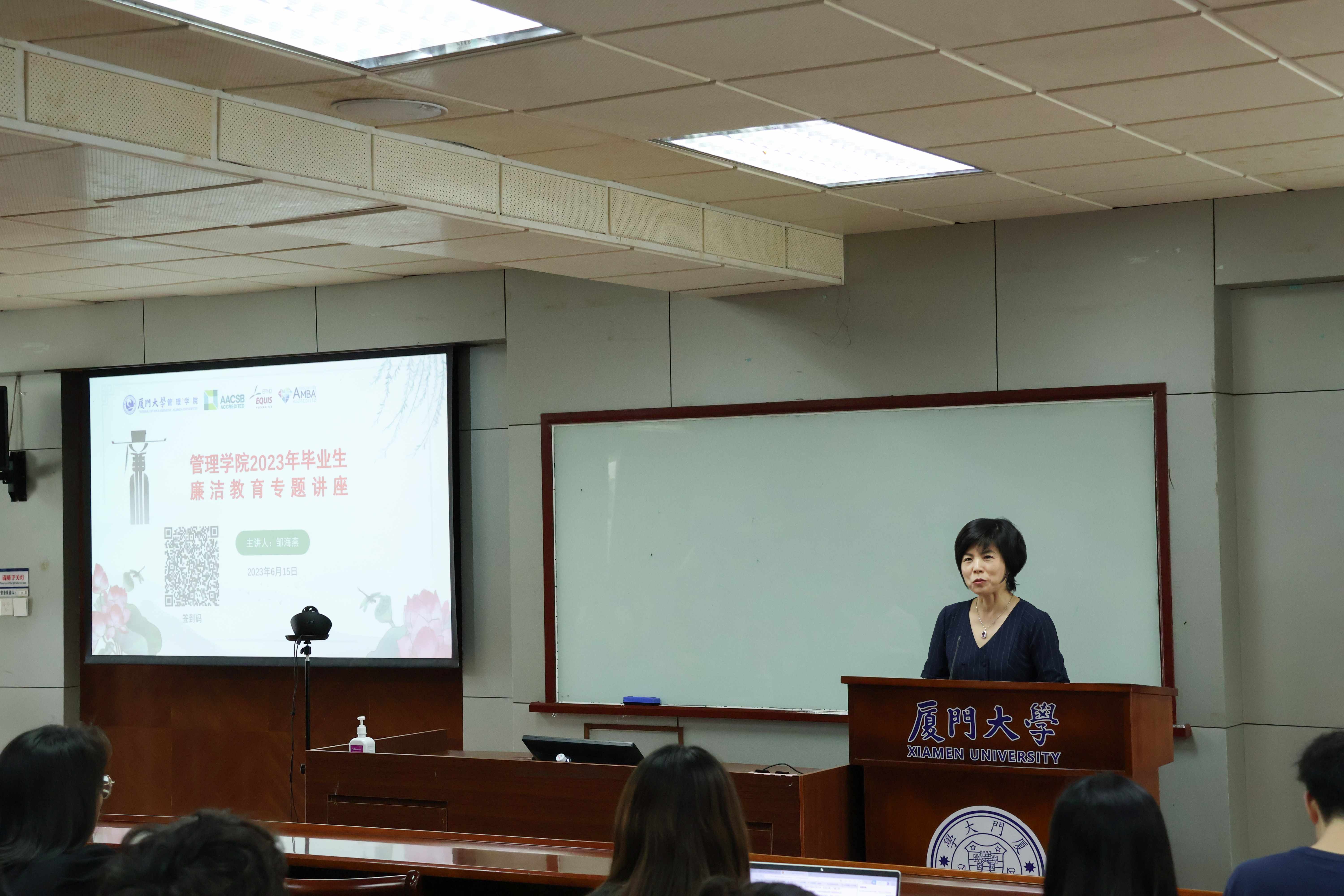6月15日上午,管理学院2023届毕业生廉洁教育专题讲座在嘉庚二201举行。厦门大学纪检监察机构办公室主任邹海燕受邀为毕业生做专题讲座。管理学院党委副书记郑碧娇、团委副书记吴荣梅出席,管理学院毕业班党支部书记、委员,即将入职公务员、选调和重要领域的毕业生参加活动。活动由郑碧娇主持。