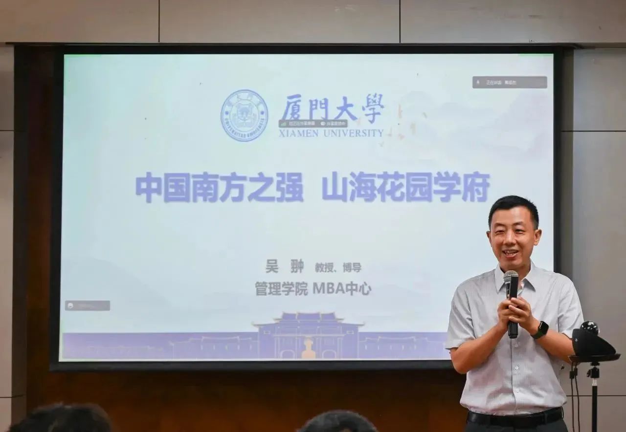 紧接着,吴翀以“中国南方之强,山海花园学府”为主题为营员们介绍了厦门大学以及管理学院的基本情况。他讲到,享有“南方之强”“山海花园”美誉的厦门大学,不仅美在校园风景,更美在开放包容、广纳群贤的内涵。厦门大学创立之初建立的商学部经过百年发展,演变成如今的管理学院。在一代又一代厦大商科人的接续奋斗下,不断加快国际化的进程。他希望同学们满载而归,破浪启航!