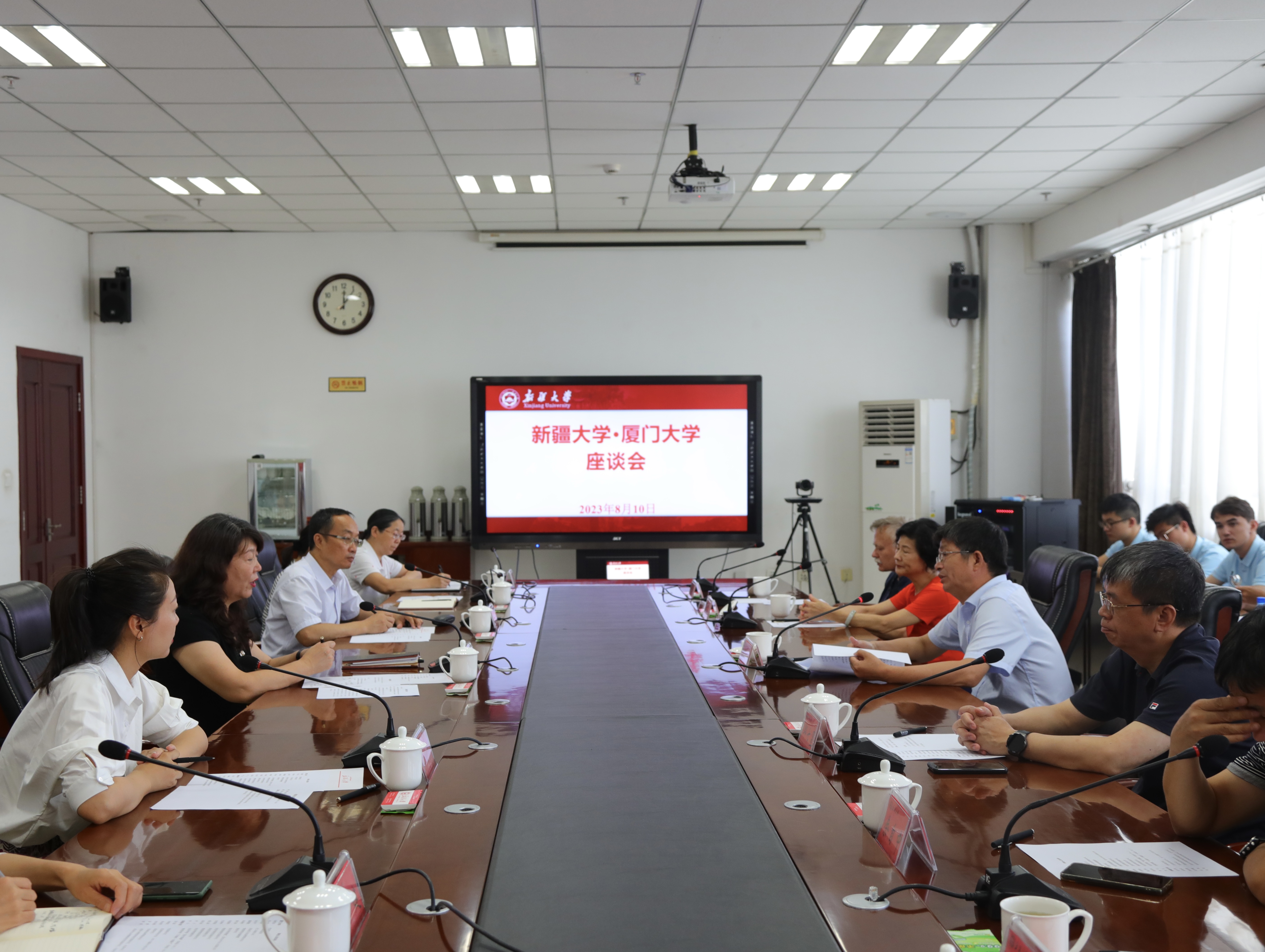 参观结束后,徐进功带领实践队师生与新疆大学开展了座谈交流。座谈由新疆大学党委副书记孟凡丽主持,新疆大学党委常委、副校长兼马克思主义学院院长顾光海等同行。座谈会上,两校师生就铸牢中华民族共同体意识、创新人才培养等方面展开热烈交流讨论。我院党委副书记郑碧娇介绍了学院近年来在铸牢中华民族共同体意识方面开展的系列实践探索,分享了此次学习交流调研的收获,表达了下一步将带着实践队深入基层、走入田间,开展扎实的调研,更好地立足学科优势,实实在在解决问题、推动工作。