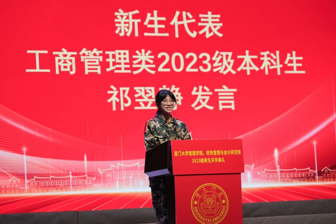 2023级工商管理类本科生祁翌静代表新生发言。她衷心感谢学校和学院的热情接待、老师和学长学姐们的深切关怀,深情讲述了自己奔赴厦门大学、选择管理学院的初衷,希望今后能够勇担使命,与同学们一起用青春诠释誓言,用拼搏铸就辉煌。