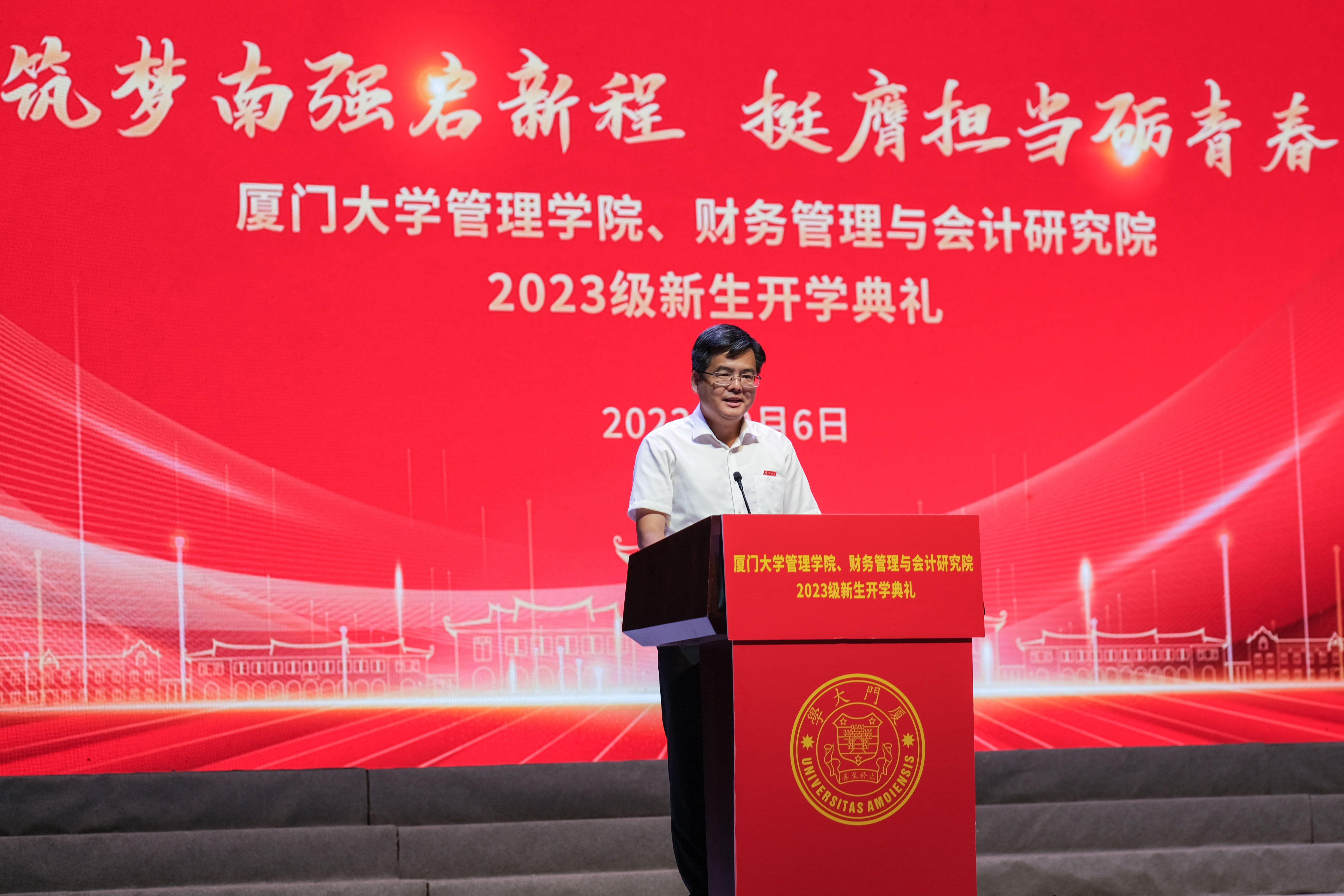 9月6日下午,厦门大学管理学院、财务管理与会计研究院2023级新生开学典礼在建南大会堂举行。管理学院党委书记张明智、院长吴超鹏教授、党委副书记郑碧娇,财会院副院长胡金帅教授,学院各系所中心领导、本科新生班主任、辅导员、教师代表及2023级全体新生出席开学典礼。典礼由管理学院党委副书记周民钦主持。