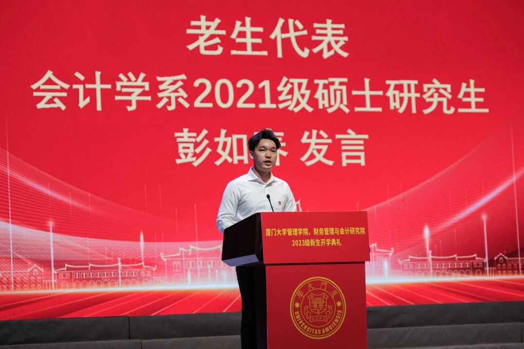 2021级会计学系硕士生彭如春代表老生发言。他回望自己过去六年的厦园生活,将学习和生活中的感悟和收获与大家分享。希望大家能找到归属感,积极探索、勇于尝试;把握分寸感,明辨是非、大方得体;秉持使命感、砥砺奋进、心怀天下。