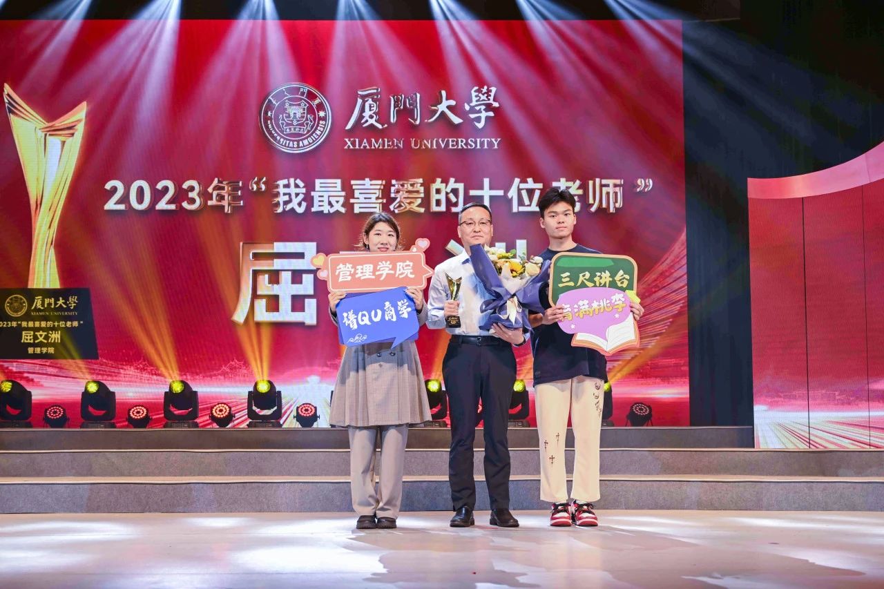 9月10日晚,由厦门大学学生会、厦门大学研究生会主办的“厦门大学2023年‘我最喜爱的十位老师’颁奖典礼”在建南大会堂举行。经过学生代表投票、评审团评分等环节,管理学院屈文洲教授在全校36位参评教师中脱颖而出,获得厦门大学2023年“我最喜爱的十位老师”的称号,成为我院第10位获此殊荣的教师。