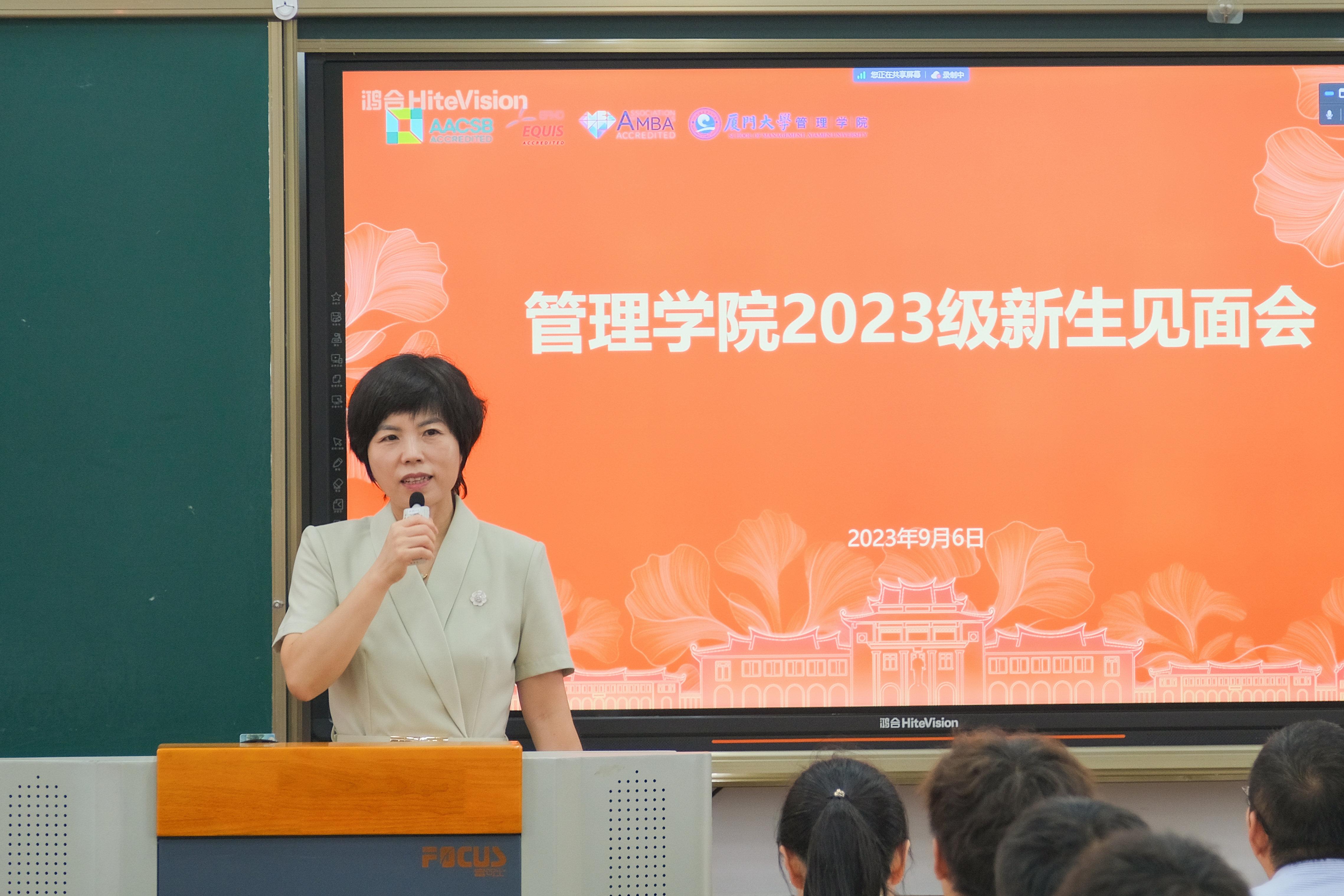 见面会伊始,郑碧娇向本科新同学表示诚挚祝贺,并热烈欢迎大家以优异成绩考入厦门大学并选择加入管理学院这个温暖的大家庭。她从历史沿革、学院特色、人才培养等方面介绍了管理学院的基本情况,鼓励同学们尽快融入新的学习生活中,做好学业生涯规划,涵养家国情怀。