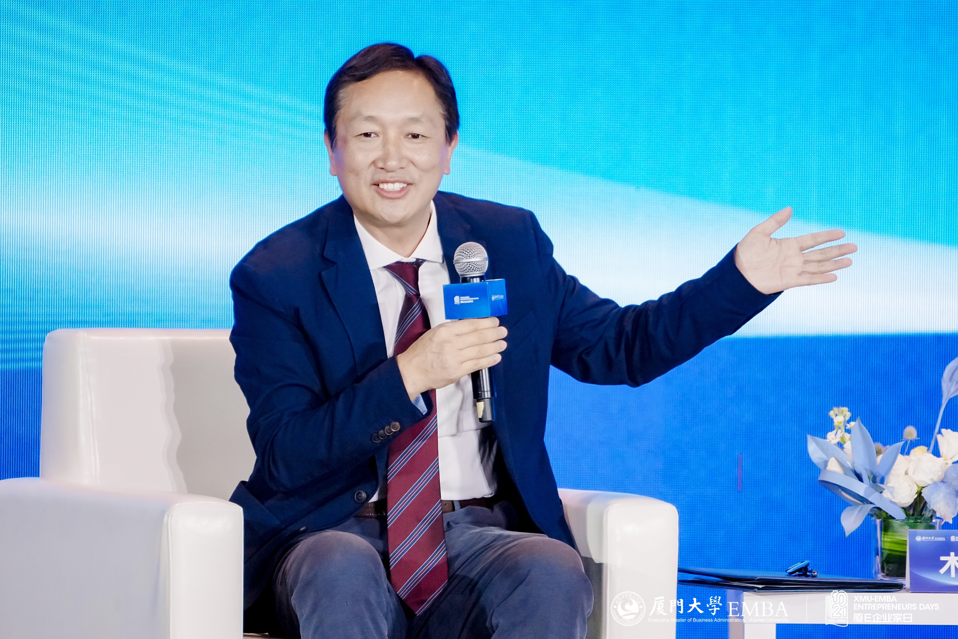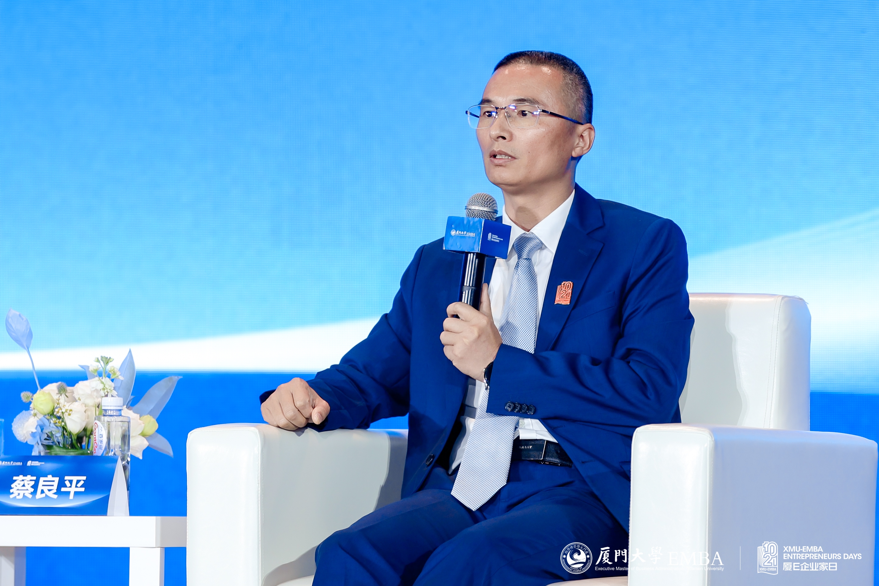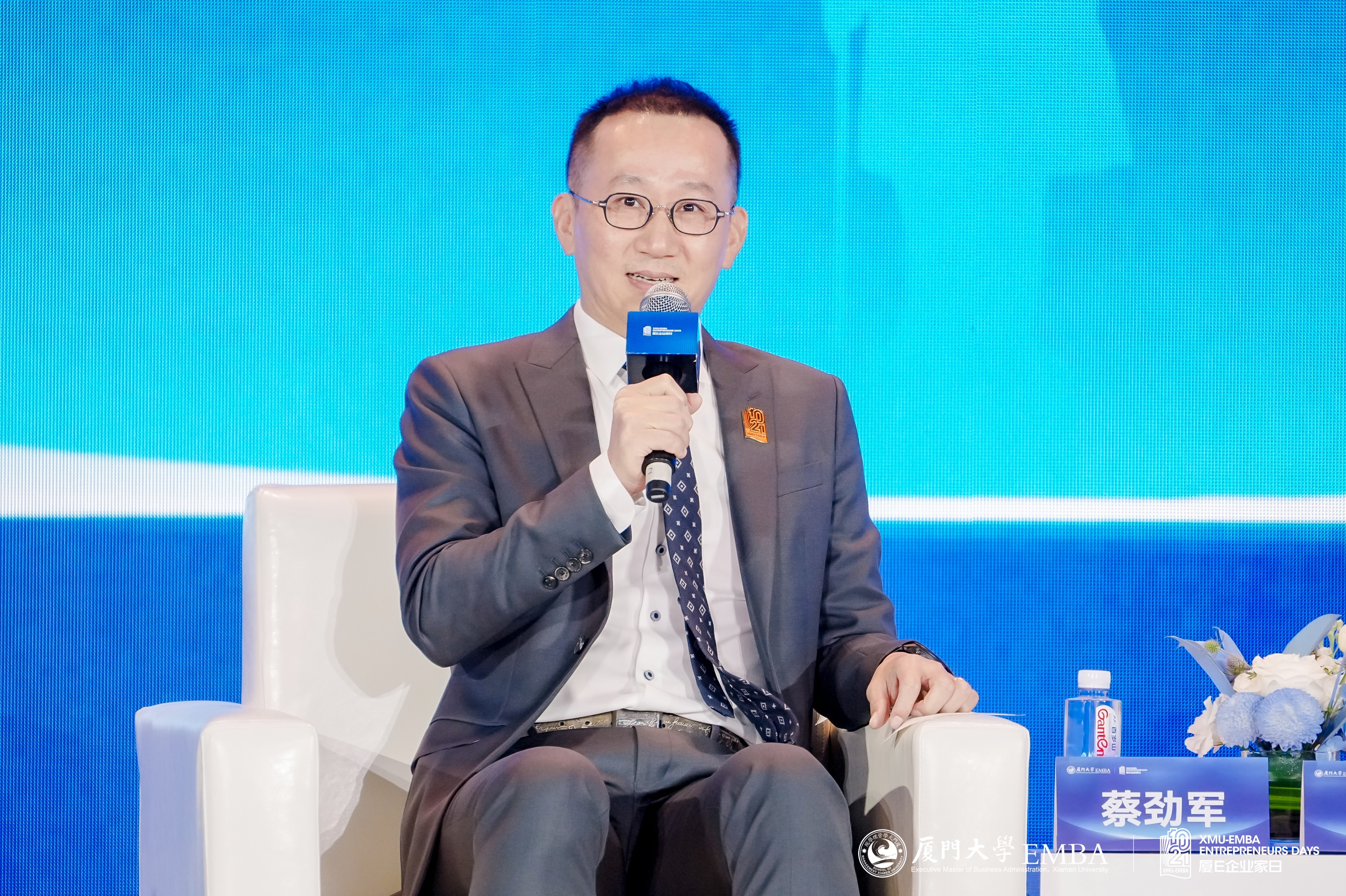 厦门大学EMBA 2011级校友、福建火炬电子科技股份有限公司董事长、戈17厦门大学代表队A队队长蔡劲军,厦门大学EMBA2022级学长导师、厦门象屿集团前董事长、厦门市企业与企业家联合会会长王龙雏,厦门大学EMBA 2013级校友、汤臣倍健股份公司首席运营官兼党委书记、透明工厂(珠海)有限公司董事长蔡良平出席圆桌论坛对话环节。