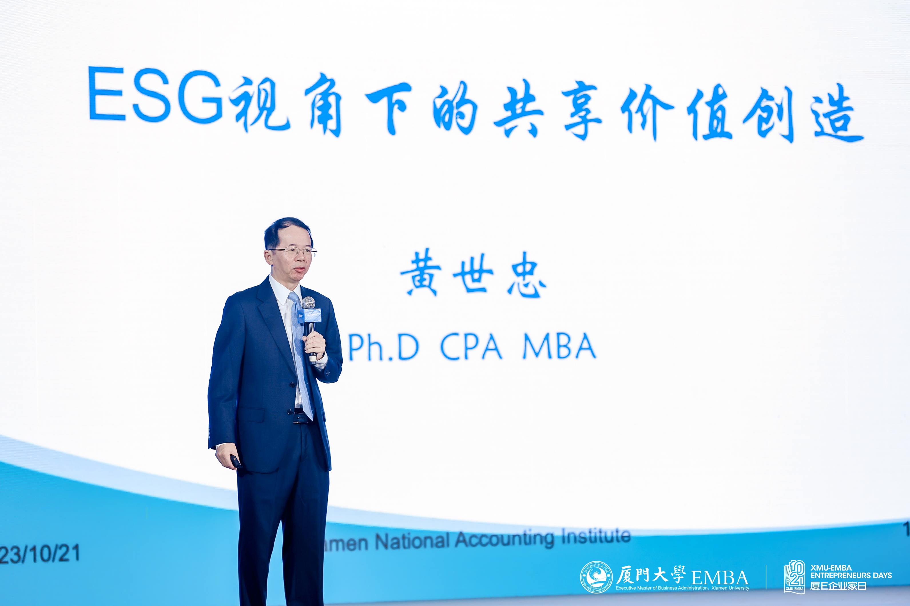 黄世忠向听众分享了ESG理念及其最新发展、价值创造的不同理论和导向、共享价值创造典型案例等方面话题。黄世忠说,在校主嘉庚先生诞辰149周年,管理学院举办以“嘉庚精神与中国式现代化”为主题的EMBA企业家论坛很有意义。“ESG视角下的共享价值创造”,就是“义利并举”,核心要义就是统筹兼顾经济价值、社会价值和环境价值,与嘉庚先生以经商之利行善举之义的精神完全契合,相互呼应。这个理念,嘉庚先生100多年前就已经付诸实施,并完美达成。在经济价值方面,嘉庚先生远赴南洋,白手起家,创造了商业奇迹。在社会价值创造方面,嘉庚先生捐资兴学,创办了集美小学、集美中学和厦门大学,福泽千千万万贫困学子。在环境价值创造方面,嘉庚先生环保理念超前,创造了生态优美、环境宜人的校园环境,营造了天人合一的校园氛围。