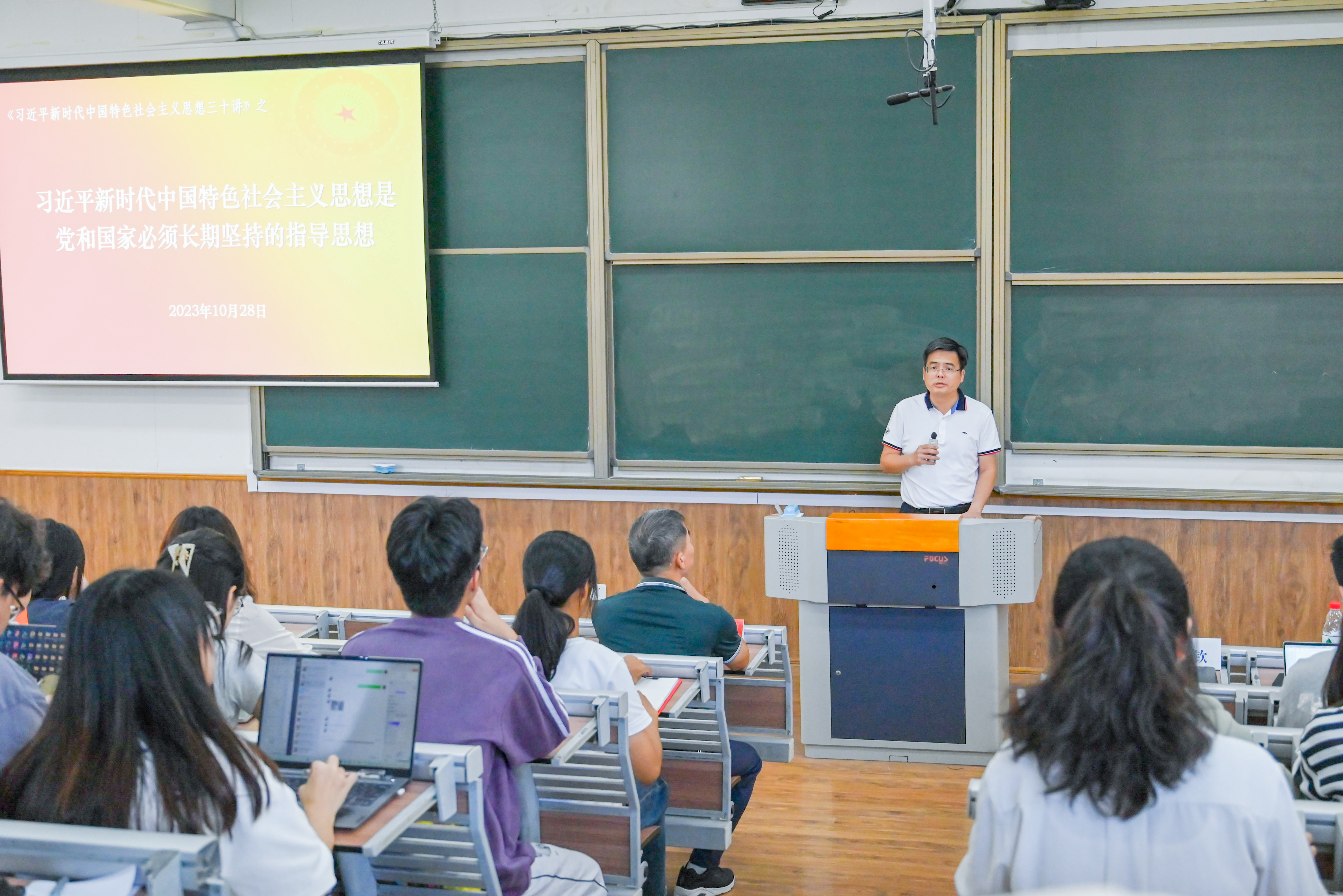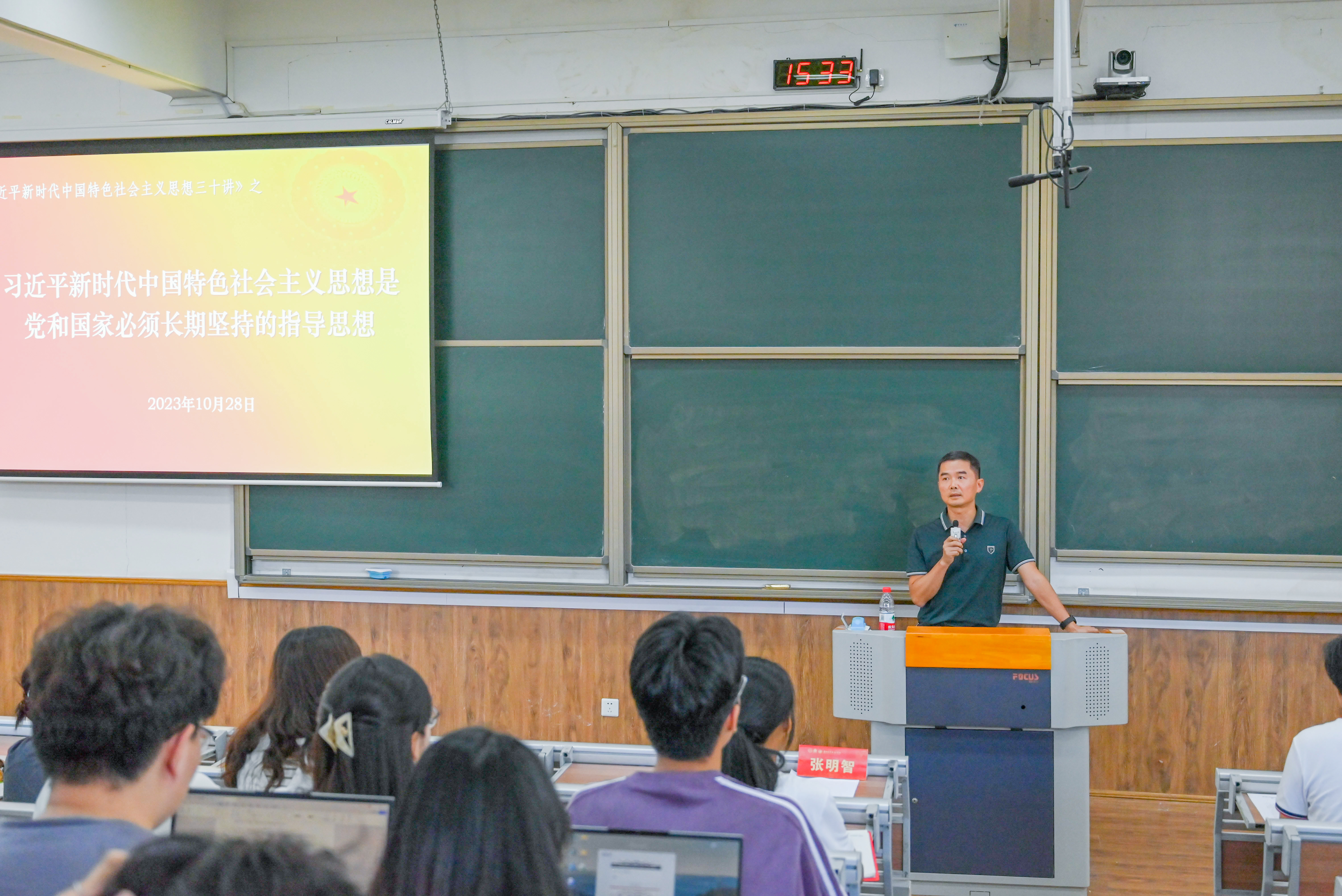 张明智作第一专题“思想旗帜”辅导报告。他表示,习近平新时代中国特色社会主义思想是立足时代之基、回答时代之问的科学理论,是系统完备的科学体系,具有特色鲜明的理论品格。作为马克思主义中国化的最新成果,习近平新时代中国特色社会主义思想是经过实践检验、富有实践伟力的强大思想武器。他提到,当代青年应勇挑大梁、争当先锋,坚持不懈用新时代党的创新理论凝心铸魂,做习近平新时代中国特色社会主义思想的坚定信仰者和忠实实践者。