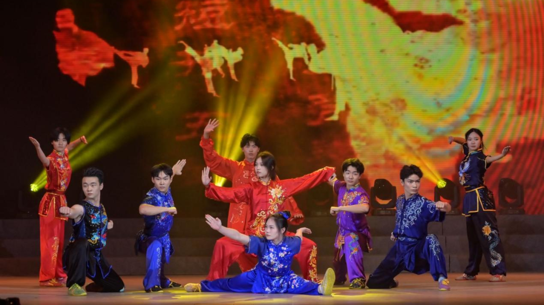 舞台灯光闪烁,配乐由缓转急,厦门大学武术队队员尽数登场——晚会也正式进入第二篇章“初‘新’如磐”。拳法矫健似龙腾,兵器舞动若惊鸿。刚柔并济,武韵华章,武术队队员们以扎实的基本功述说传武魅力,为全体观众带来了独属中华的视听盛宴。