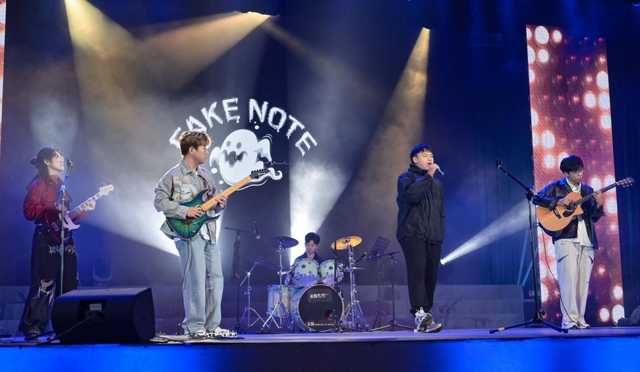 伴随着老朋友Fakenote乐队的登台演出,晚会进入了最终章——“‘新’之所向”。Fakenote乐队为大家带来了歌曲《山海》,动感的韵律,富有穿透力的嗓音,伴着不断变化的舞台灯光,乐队成员娴熟的演奏技巧以及主唱扎实的唱功博得了观众的阵阵欢呼与掌声,将晚会推上了一个高潮。