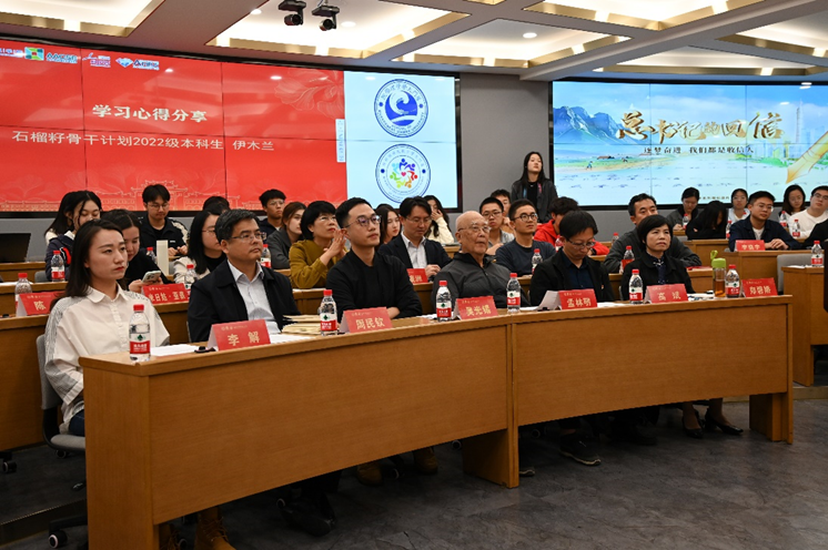 接着,石榴籽骨干计划学生代表伊木兰、2022级工商管理团支部书记乔梦雪、工商类本科生联合第二党支部党员李居栋、少数民族预科班2023级预科生王泽靖四位同学先后分享学习心得。
