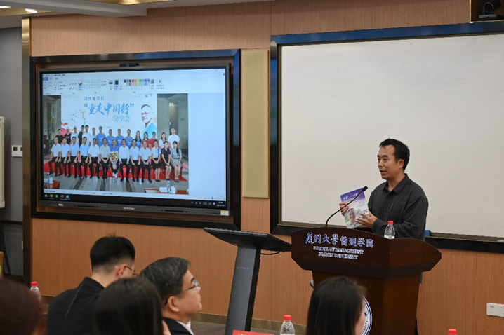 2019年春节,习近平总书记给管理学院外籍教授潘维廉回信,祝贺他的新书出版,感谢他把人生30年的宝贵时光献给了中国的教育事业,相信他将会见证一个更加繁荣进步、幸福美好的中国。2019年7-8月,潘维廉与厦大师生历时31天重走中国,行程近2万公里。作为2019年全程与潘维廉一起重走中国的老师,揭上锋通过朗诵总书记回信、展示当年代表性照片以及分享自己的亲身感悟,带头解读了回信精神。
