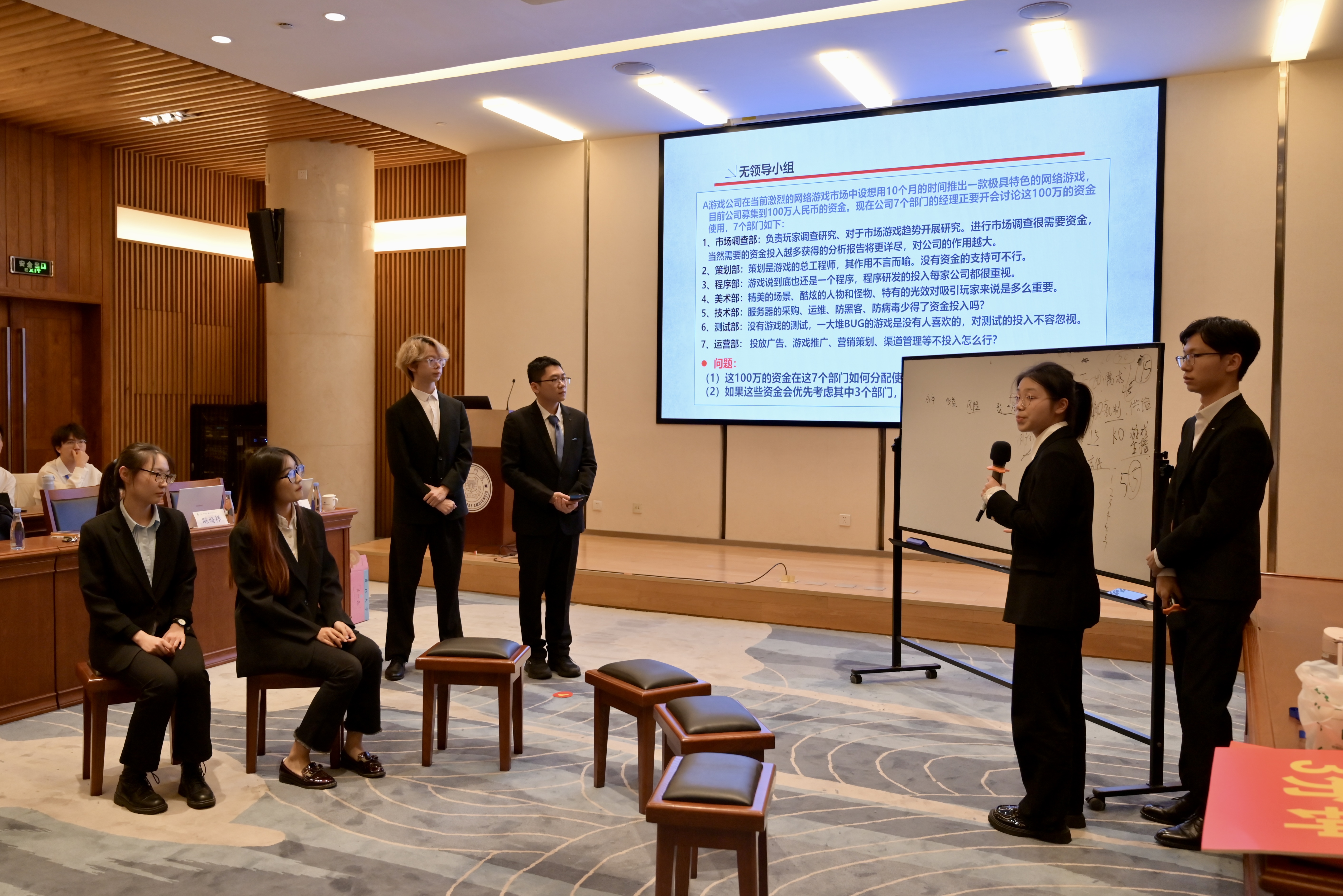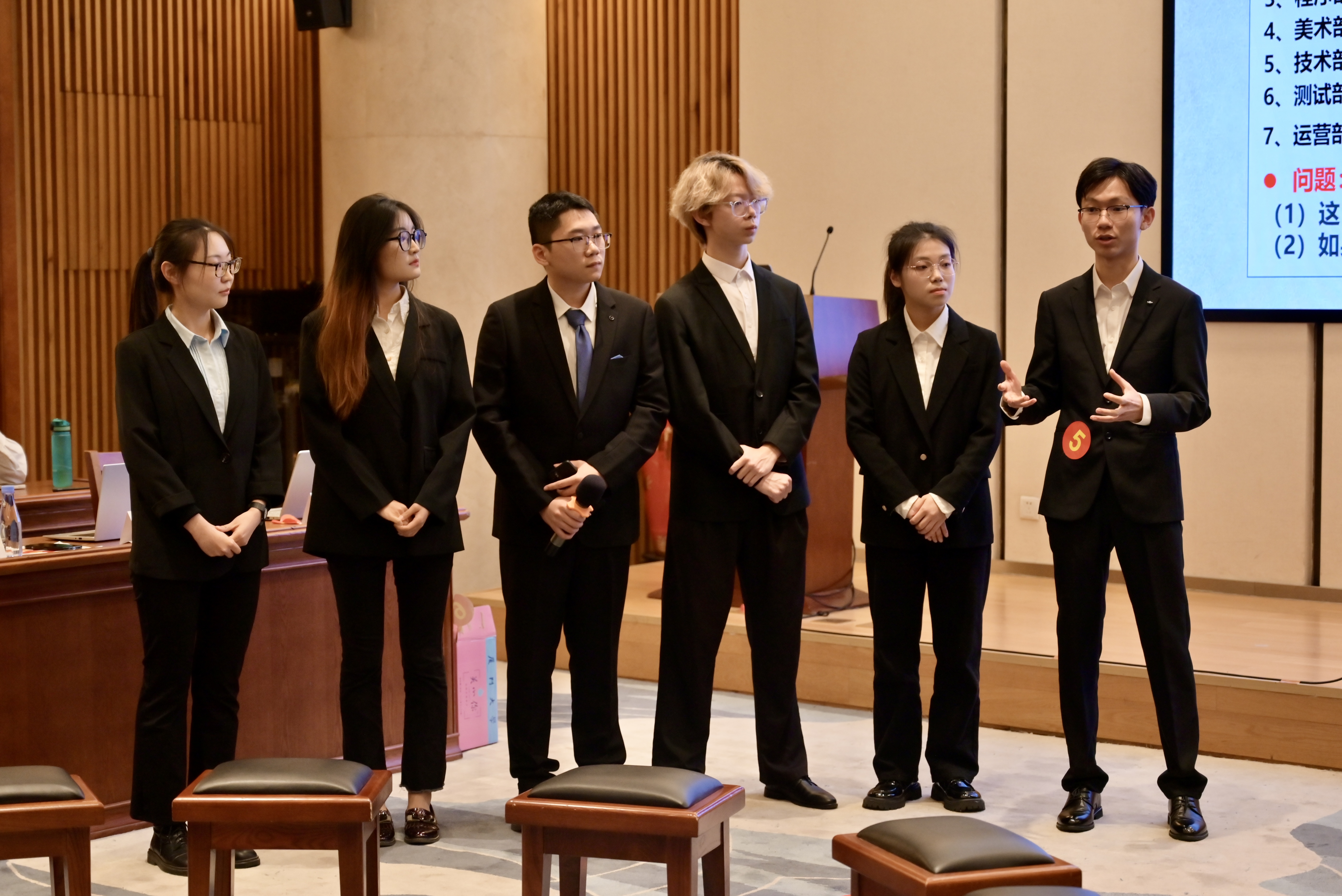 随后,比赛正式开始。管理学院2021级本科生陈晓祥、林于捷、王华琛,经济学院2020级本科生宋思佳、2021级本科生张一诺,建筑与土木工程学院2021级本科生王城树等6位优秀选手,经过简历海选和面试选拔,从140多名参赛选手中脱颖而出闯入决赛。本场决赛中,选手们从自我介绍、职业测评、无领导小组、评委问答等四个环节展开角逐。